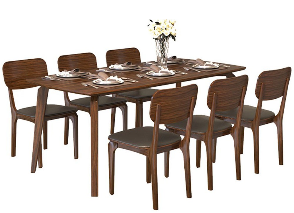 Bộ bàn ăn cao cấp chất liệu gỗ tự nhiên tần bì sơn màu hạt dẻ, mặt bàn được thiết kế vát cạnh và sơn màu óc chó.