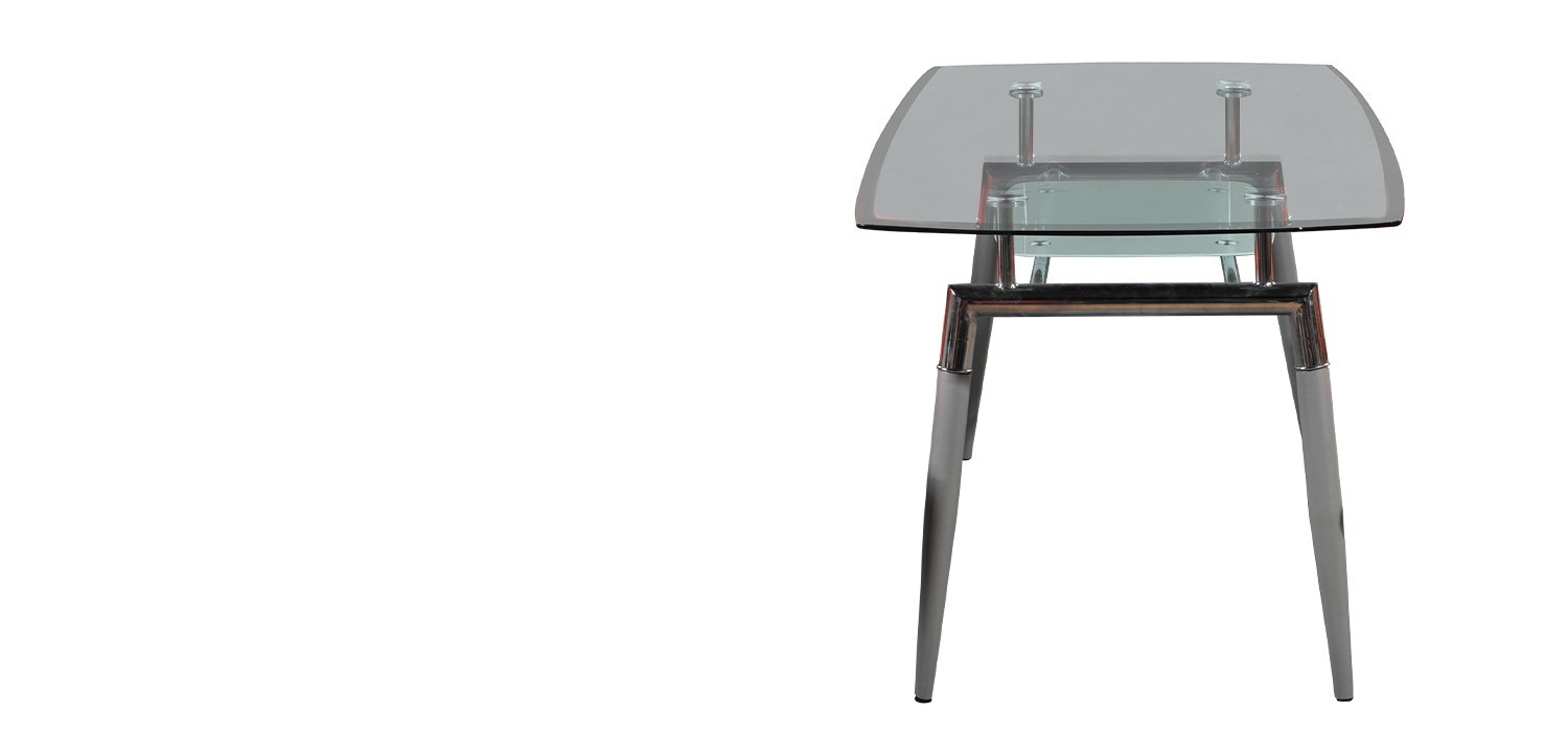 Bàn ăn khung thép mạ, mặt bàn sử dụng kính cường lực và có thêm ngăn nhỏ ở dưới.