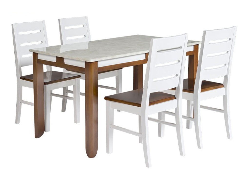 Bàn ghế ăn cao cấp khung gỗ tự nhiên, mặt bàn sử dụng đá tự nhiên được tạo vân theo công nghệ hiện đại.