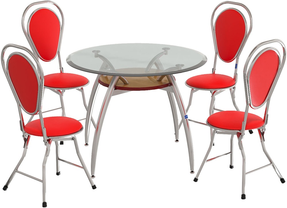Bàn ăn khung thép mạ sử dụng mặt kính cường lực tròn, bàn có ngăn bằng gỗ sơn Pu.