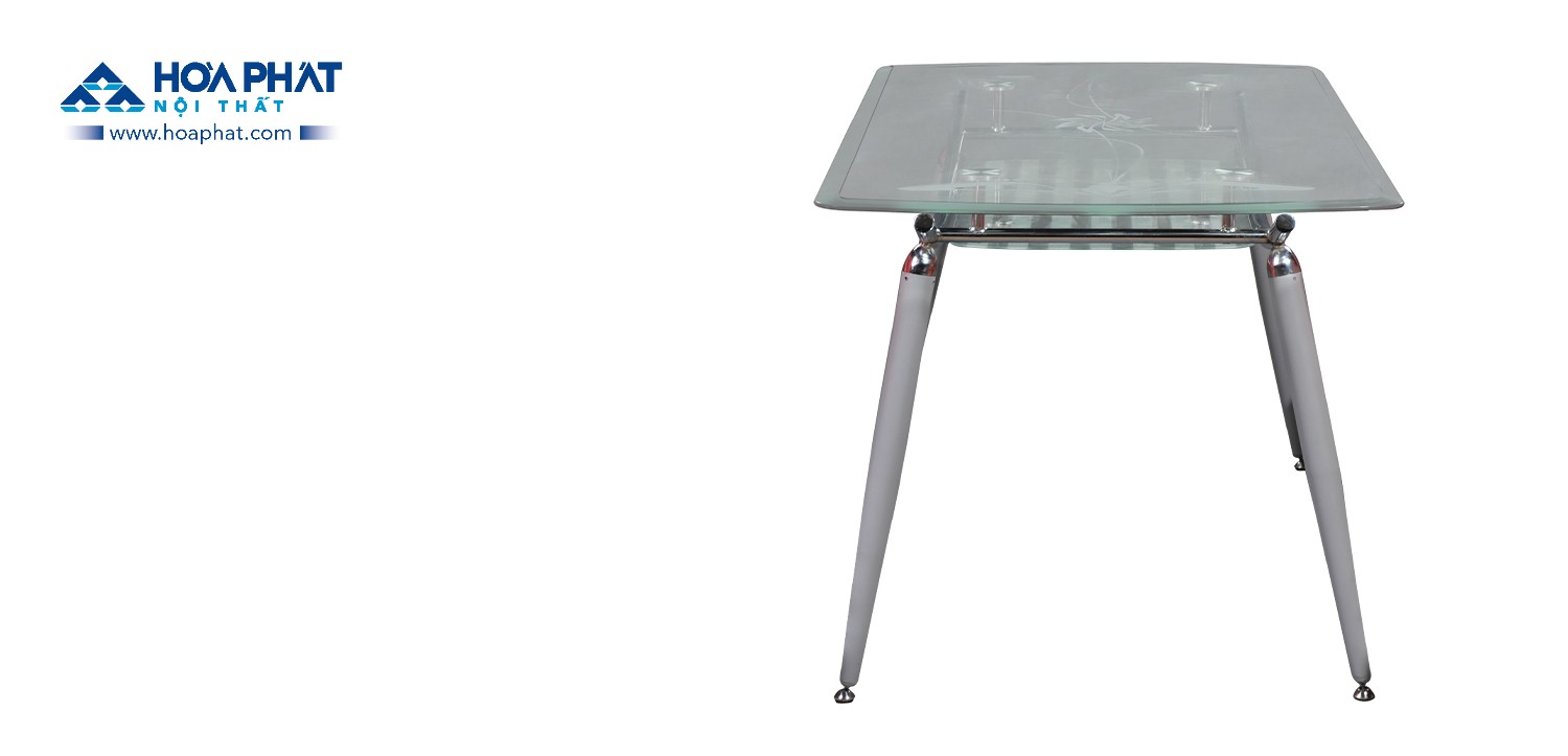 Bàn ăn khung thép mạ, mặt bàn và ngăn bàn bằng kính.