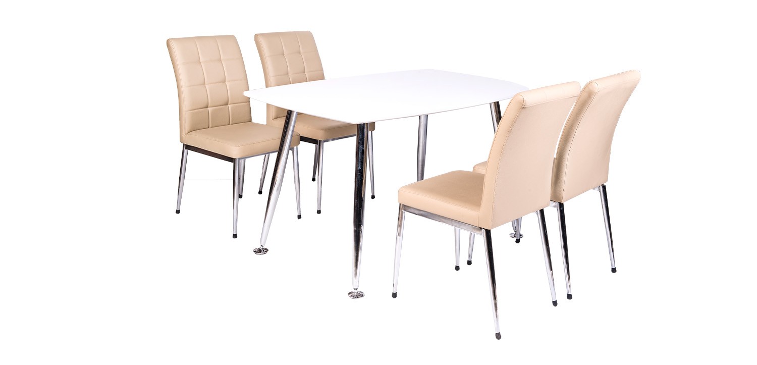 Bộ bàn ghế ăn cao cấp khung thép mạ gồm 1 bàn và 4 ghế, mặt bàn gỗ công nghiệp được phủ sơn PU cao cấp màu trắng bóng.