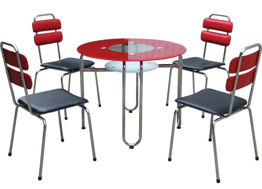 Bộ bàn ghế ăn khung thép mạ, mặt kính cường lực hình tròn được sơn màu trang trí.