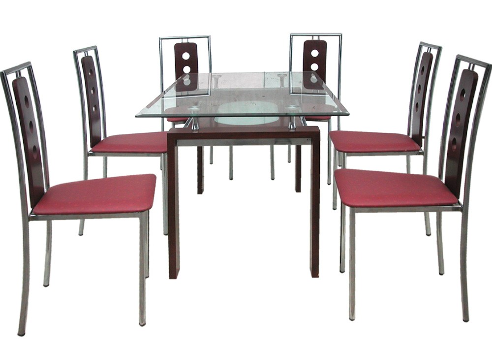 Bàn ăn mặt kính, khung là sự kết hợp gỗ tự nhiên với khung thép mạ, có ngăn bàn.
