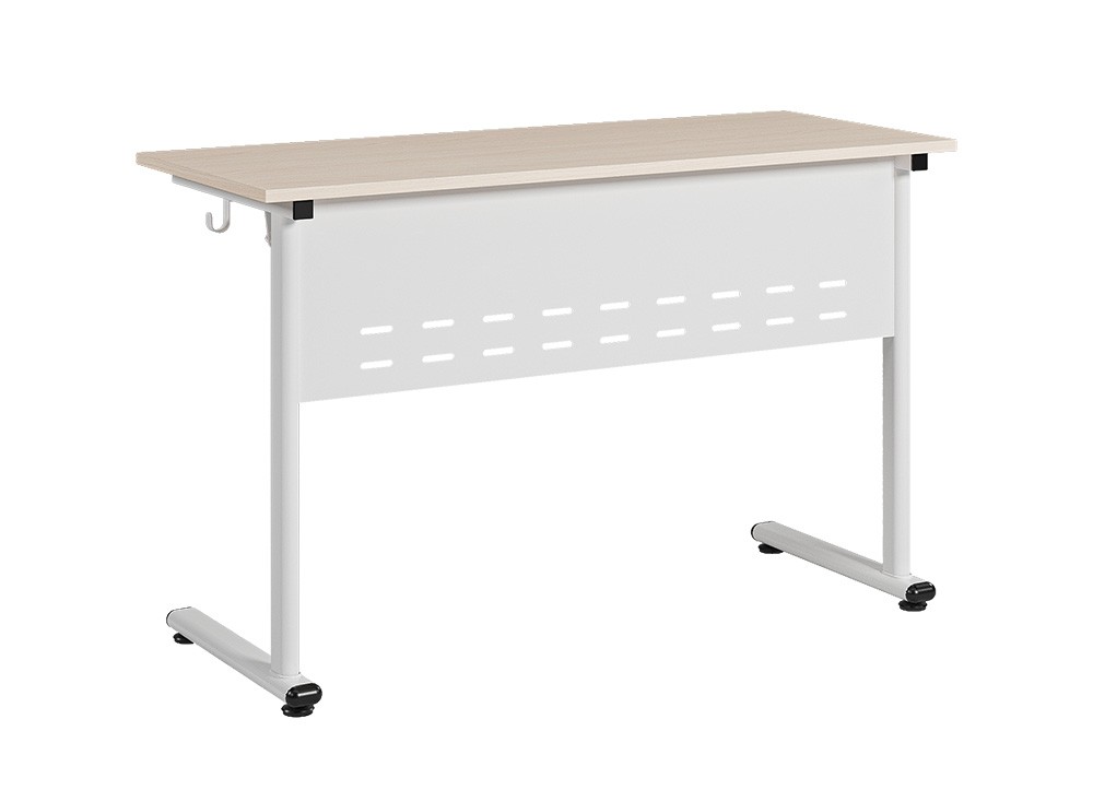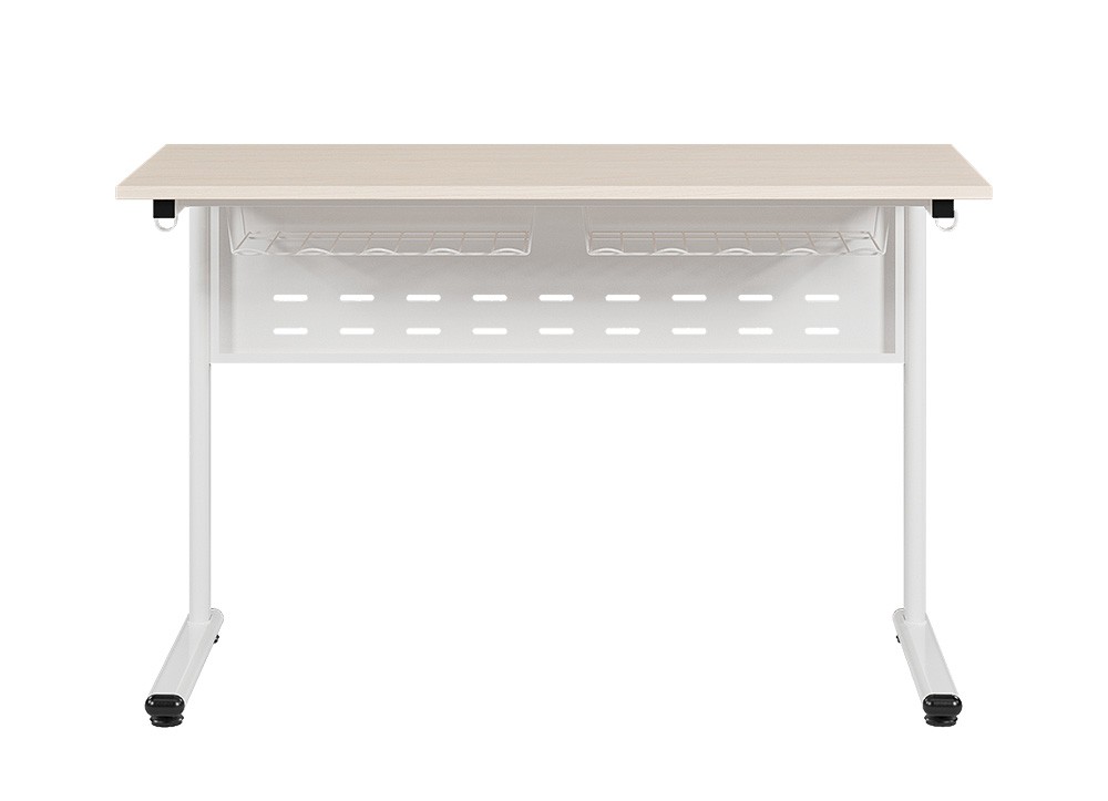 Bàn học sinh 2 chỗ ngồi, khung thép sơn trắng. Mặt bàn gỗ melamine, ngăn bàn thép sơn kết hợp