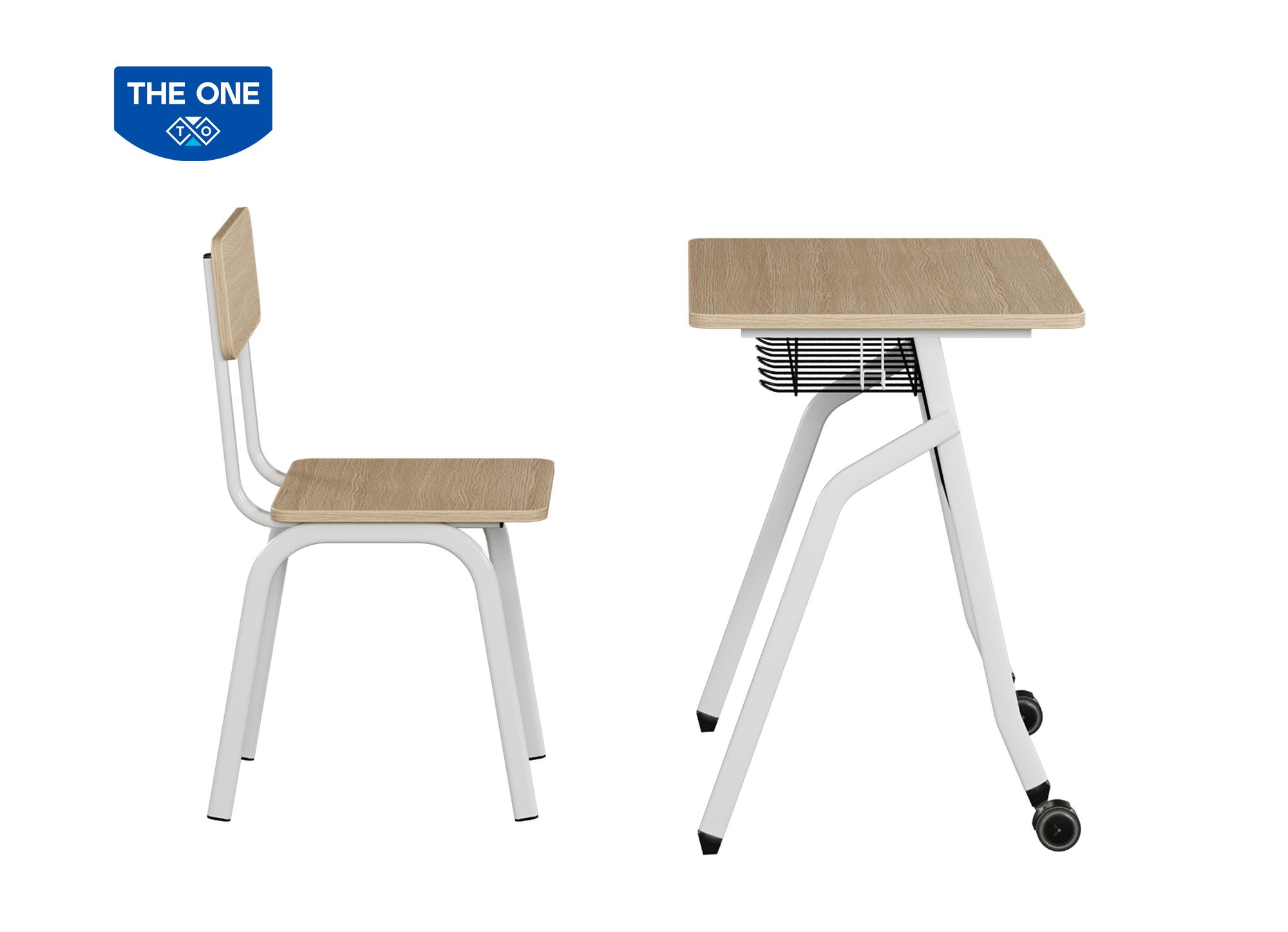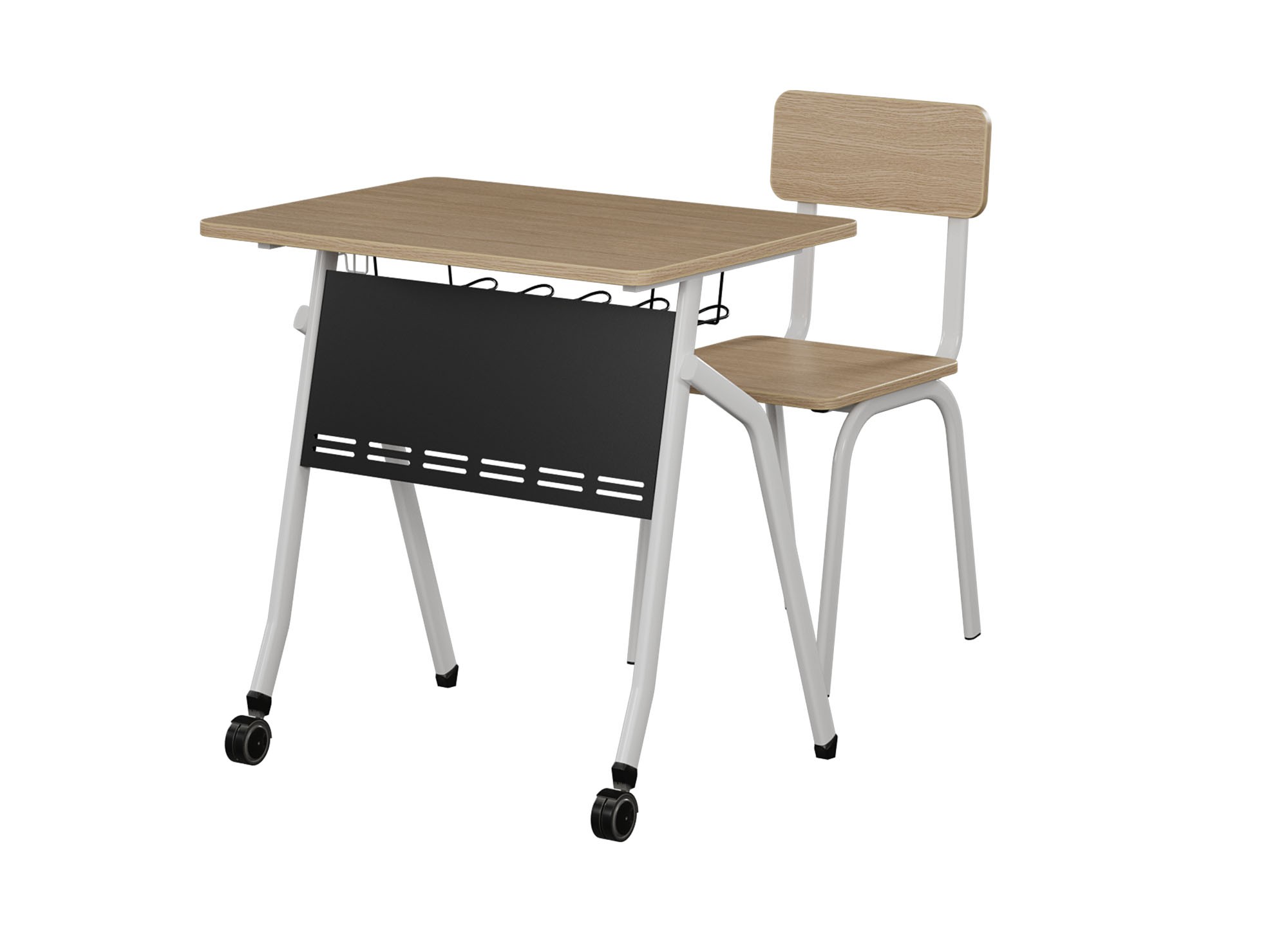 Bộ bàn ghế học sinh khung thép sơn trắng, yếm + ngăn bàn sơn đen. Mặt bàn + đệm tựa ghế gỗ Melamine, Chân trước bàn có trang bị bánh xe có hãm thuận tiện cho việc di chuyển.