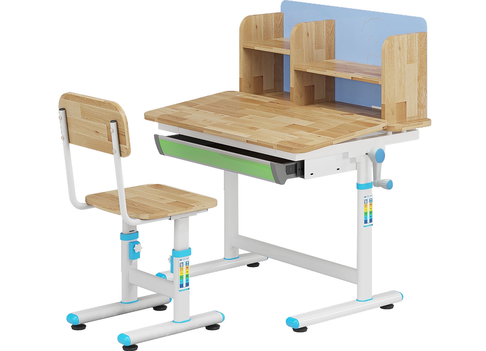 Bộ bàn học sinh khung thép sơn trắng gỗ M50 cạnh bàn dán nẹp 3D Bàn có ngăn kéo nhựa tiện dụng để đồ dùng học tập, phần giá sách gỗ kết hợp tấm hậu tôn sơn cùng màu nẹp mặt bàn. Bàn sử dụng cơ cấu tăng chỉnh chiều cao bằng tay quay tiện dụng. Đệm tựa ghế gỗ cao su