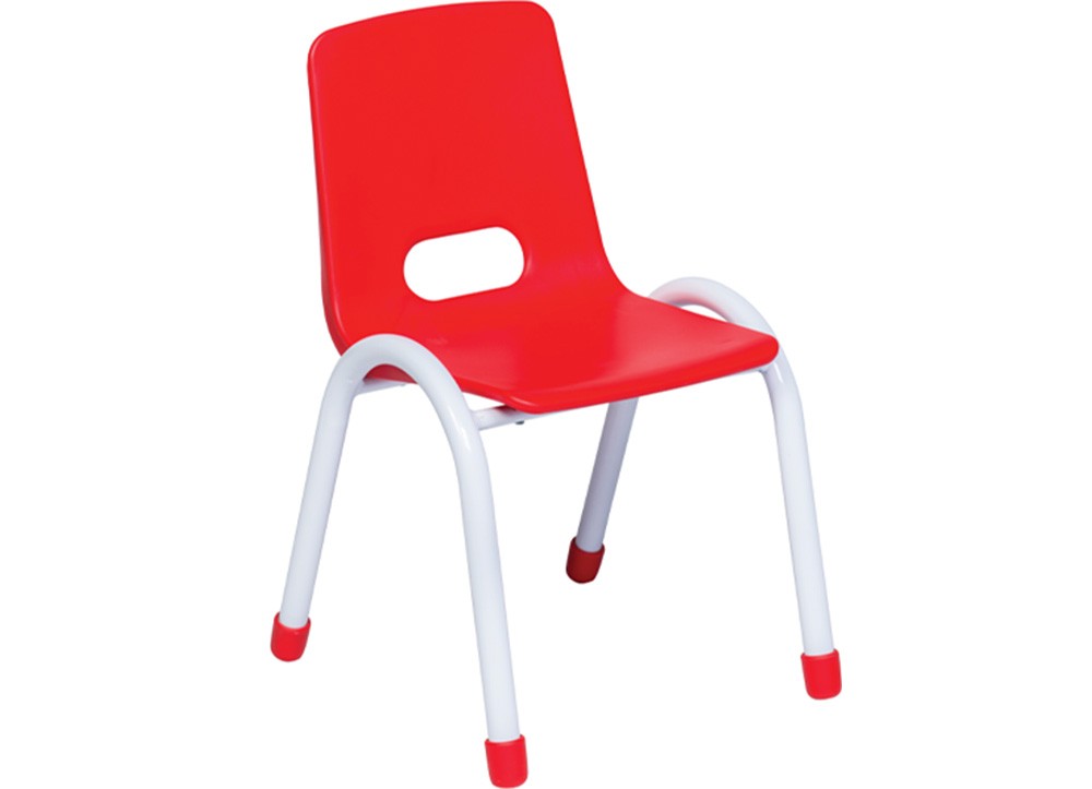 Ghế mẫu giáo khung sơn tĩnh điện, đệm và tựa ghế bằng nhựa. Ghế có thể xếp chồng lên nhau khi không sử dụng.