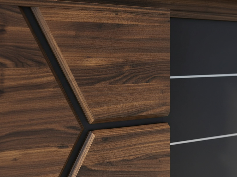 Họa tiết trang trí: Góc tủ phụ được nhấn nhá bằng các đường vát chéo hình khối học đặc trưng, tạo nên vẻ ngoài độc bản, khác biệt hoàn toàn so với các dòng bàn truyền thống.