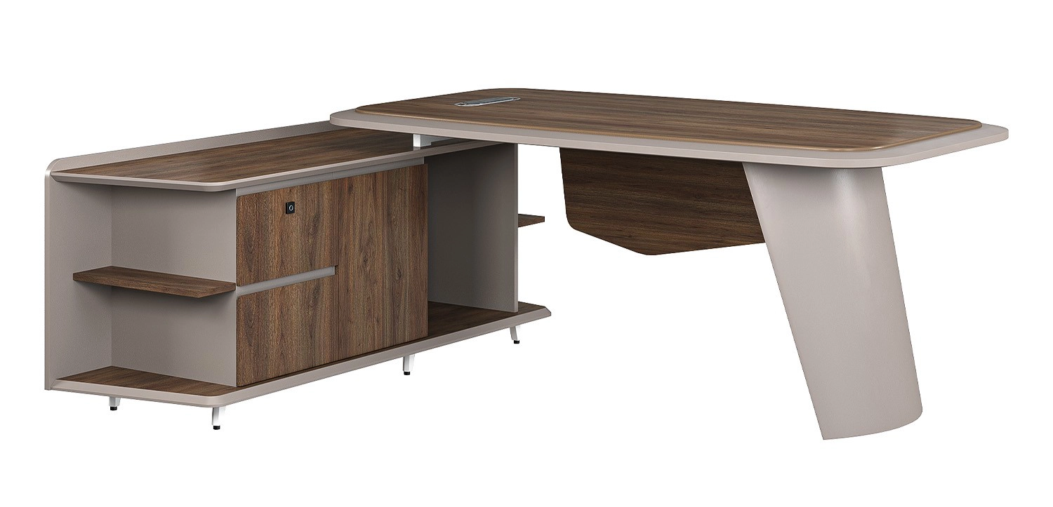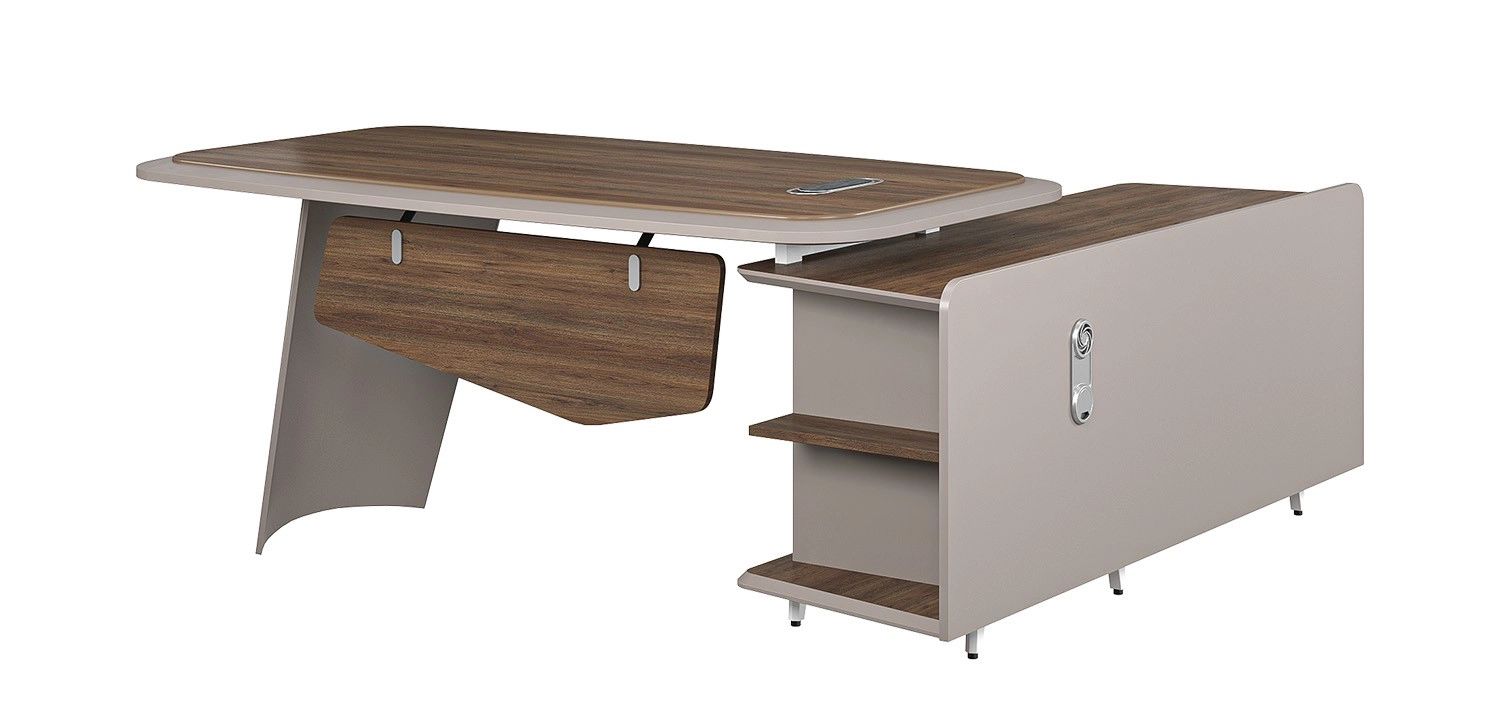 Bàn lãnh đạo LUXURY SUPREME S8 chất liệu melamine kết hợp sơn PU. Bàn có thiết kế tủ phụ liền bàn có ngăn kéo cánh mở và khóa cảm ứng. Chân bàn uốn cong, mặt bàn ghép viền cạnh sơn. Mặt dày 40mm mặt trên ốp tấm melamin, bàn có nắp ổ cắm tích hợp lỗ đi dây hiện đại.