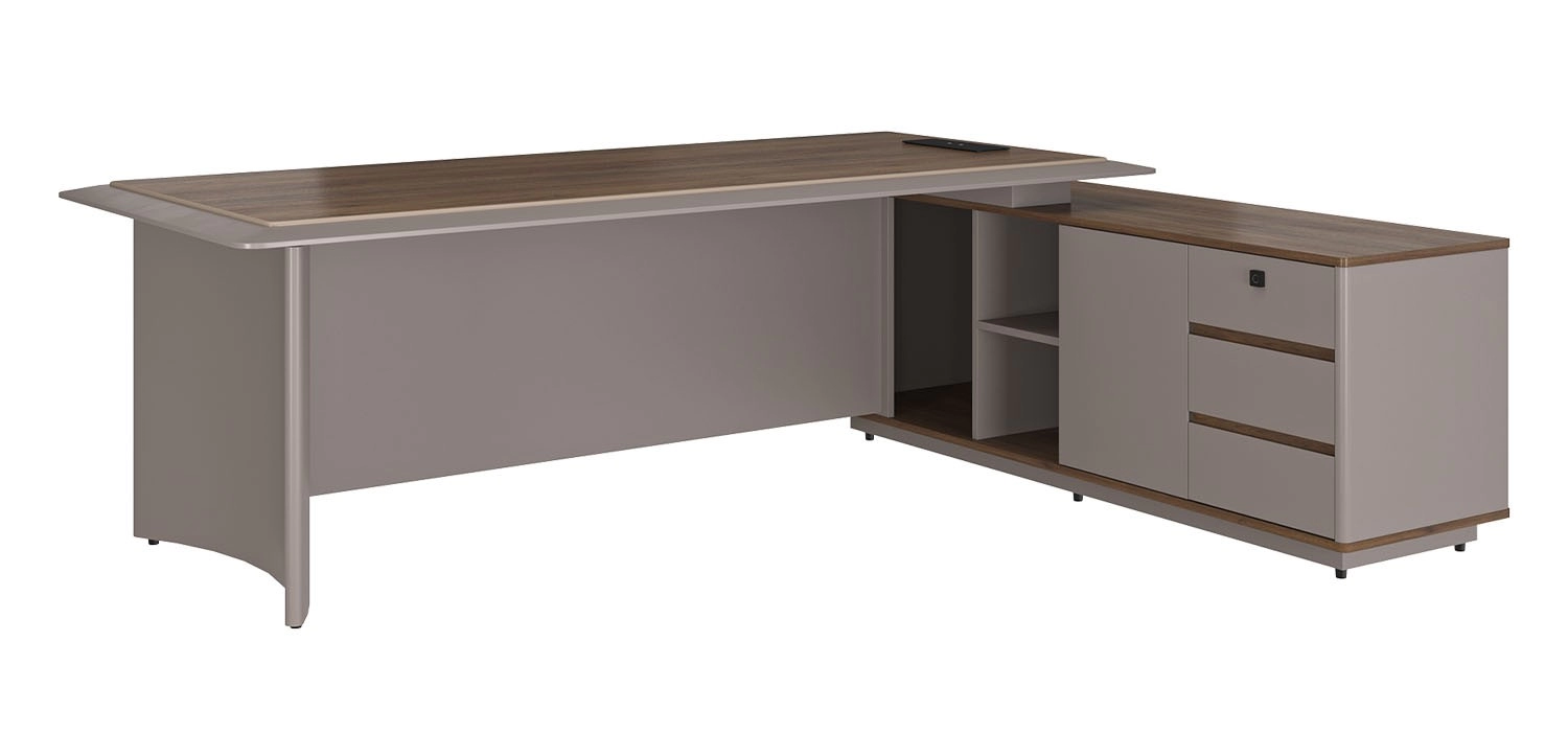 Bàn lãnh đạo LUXURY SUPREME S2 chất liệu gỗ sơn+ melamine Mặt bàn có 01 nắp hộp điện, Kiểu dáng hiện đại, sang trọng, góc cạnh mặt bàn được bo tròn đều. Tủ phụ có kèm khóa cảm ứng vân tay tại ngăn kéo.