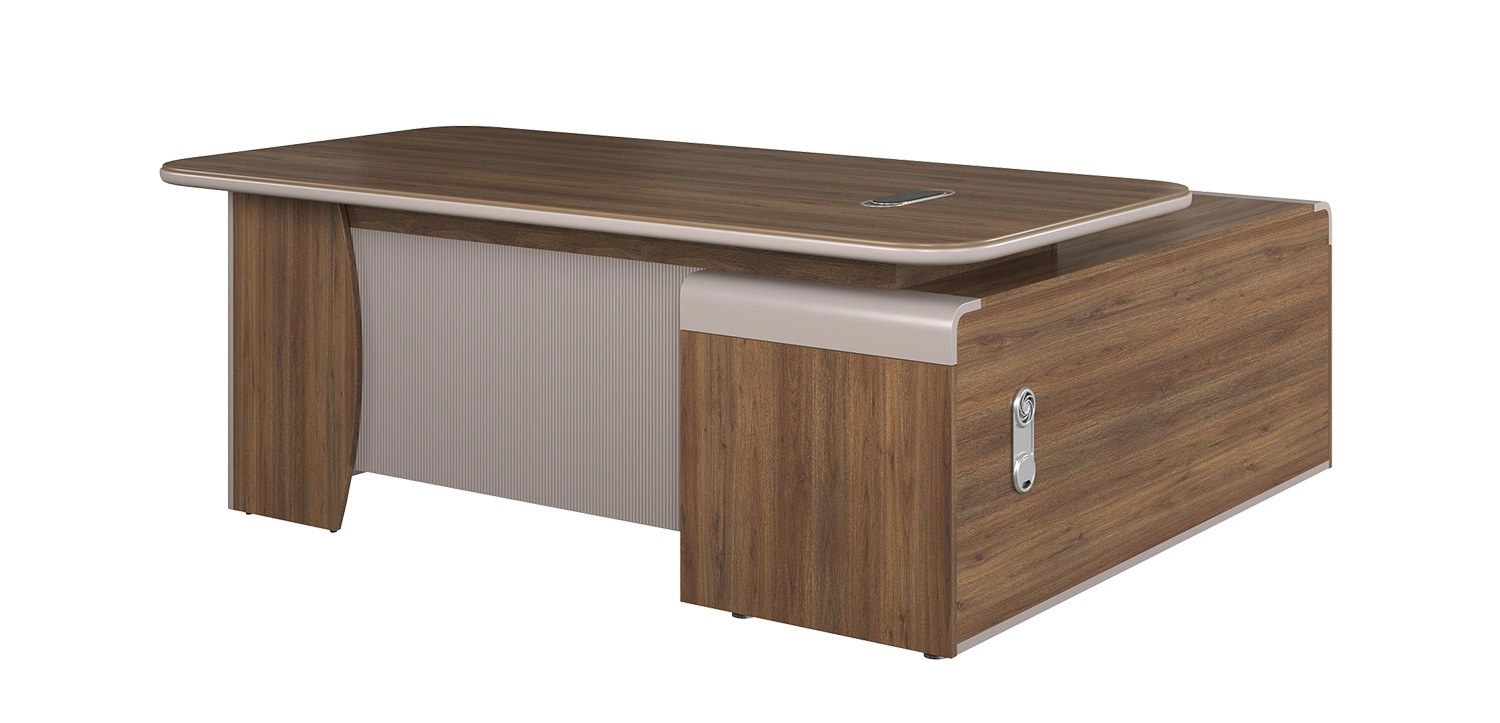 LUXB2018S7 Bàn lãnh đạo LUXURY SUPREME S7 chất liệu gỗ sơn PU+ melamin. Kiểu dáng hiện đại, sang trọng, góc cạnh mặt bàn được bo tròn đều, tủ phụ liền bàn có khoang ngăn kéo và cánh mở, ngăn kéo sử dụng khóa cảm ứng. yếm bàn sử dụng ốp song chỉ cầu lõm, tủ phụ nóc sơn uốn cạnh. Mặt bàn dung nắp đi dây hiện đại, khắc logo The One