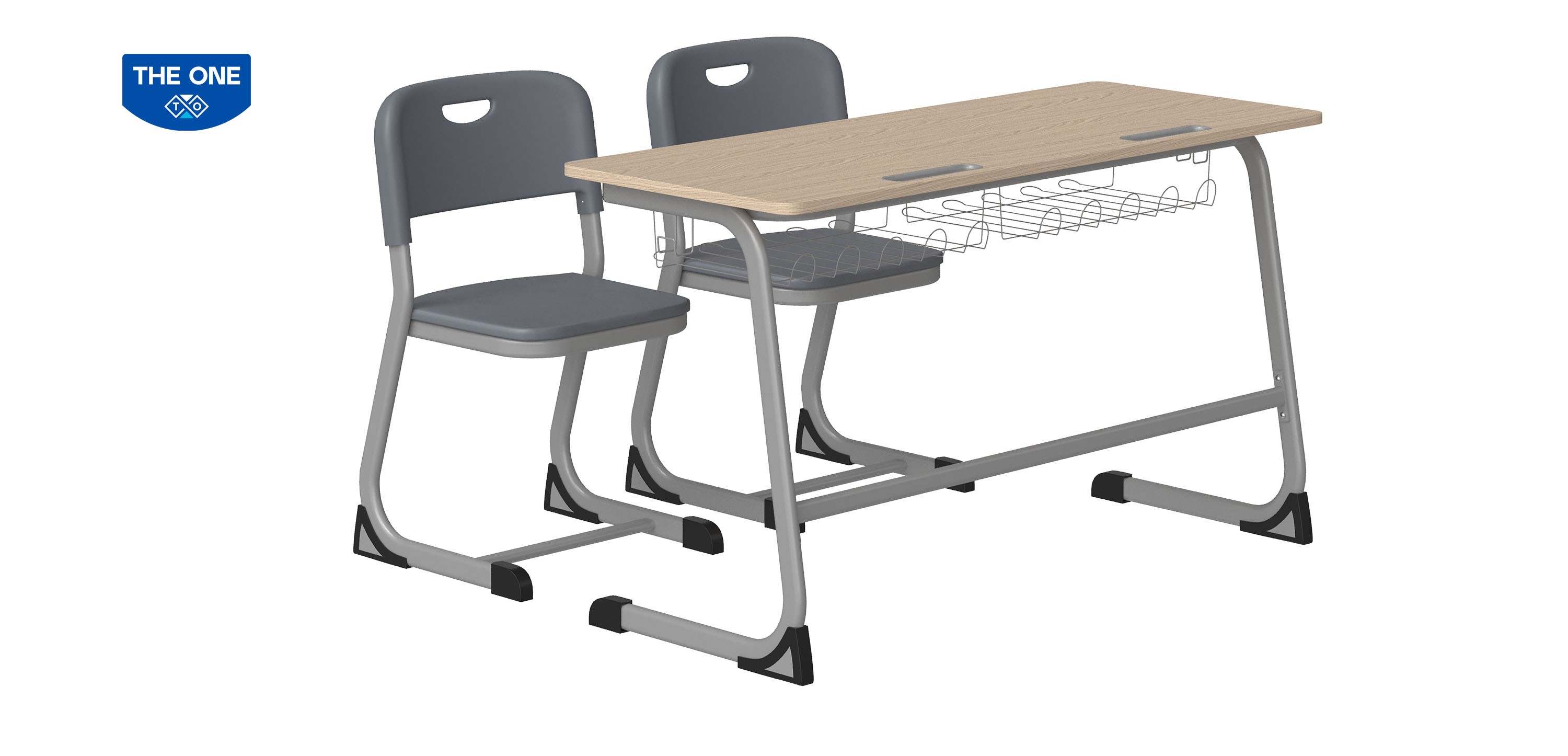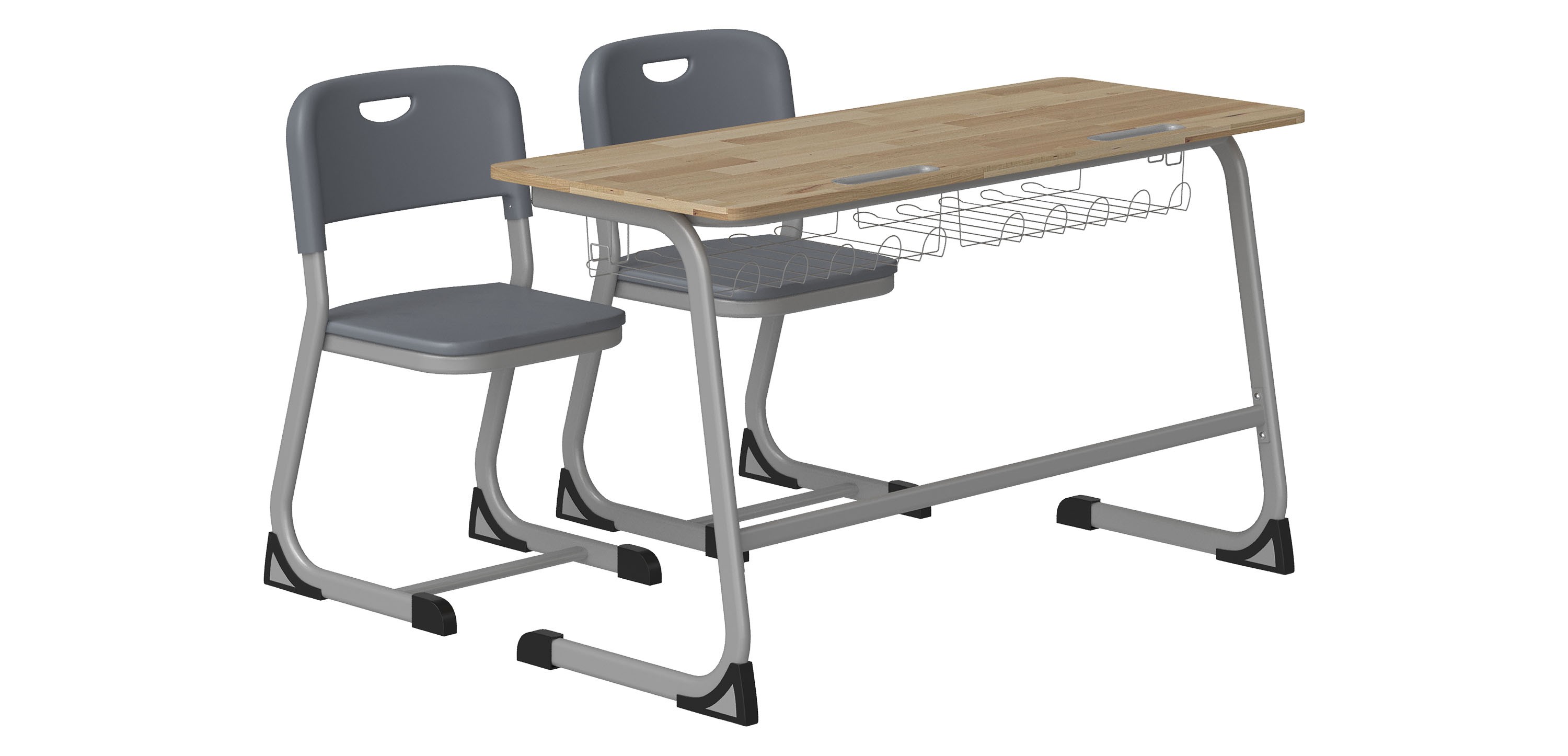 BHS44: Bàn học sinh đôi, khung thép sơn tĩnh điện màu ghi, mặt gỗ melamine. Bàn có ngăn để đồ và móc cặp tiện dụng.