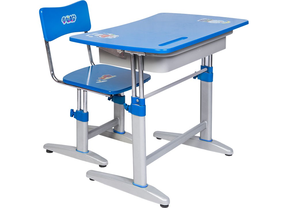 Bộ bàn ghế học sinh khung thép, mặt bàn và đệm tựa ghế bằng gỗ sơn PU con giống.