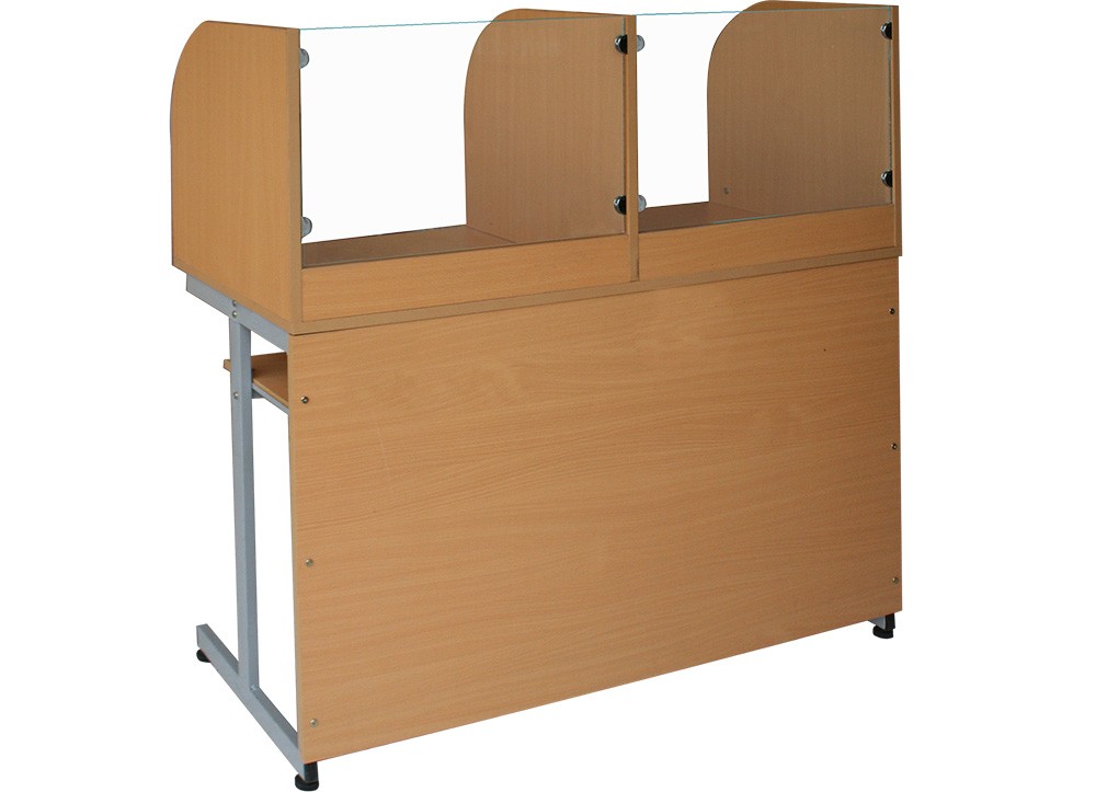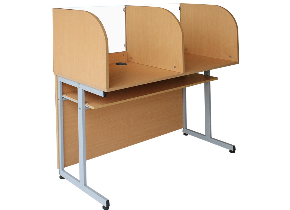 Bàn học tiếng khung thép mặt gỗ Melamine, có 2 chỗ ngồi, có vách ngăn trên mặt bàn