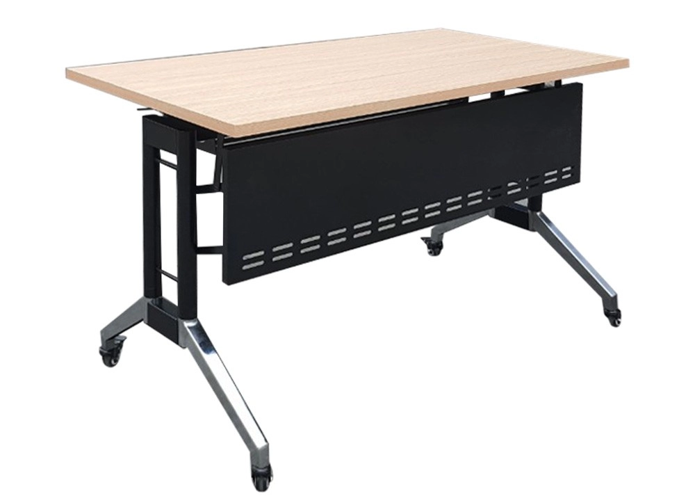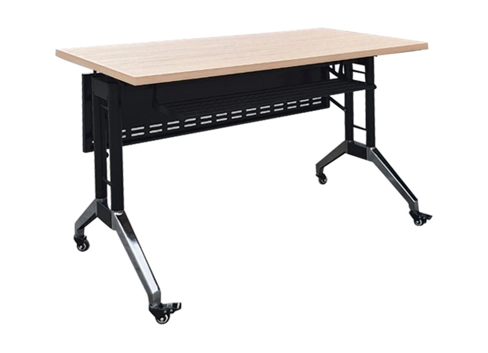 Bàn hội trường gấp mặt, khung thép sơn đen kết hợp chân mạ. Mặt bàn gỗ công nghiệp phủ melamine. Bàn có 4 bánh xe có khóa hãm