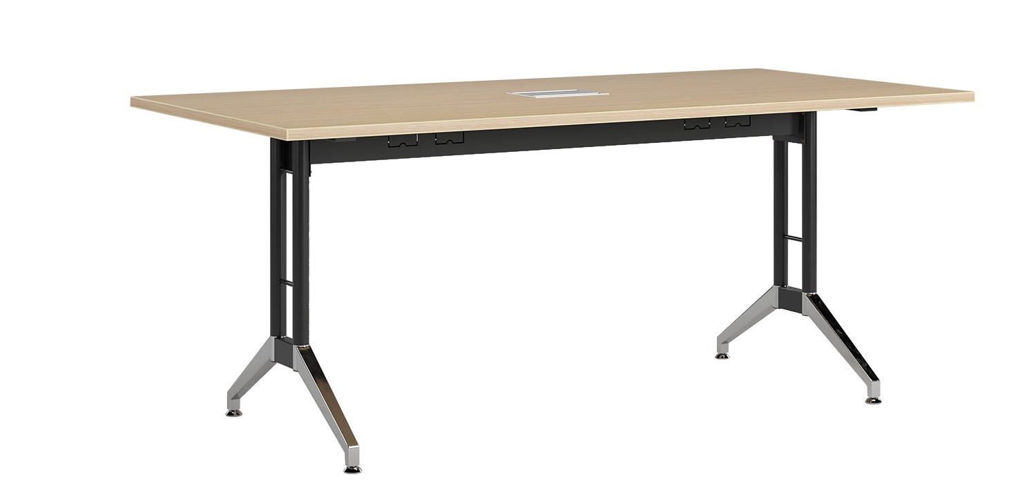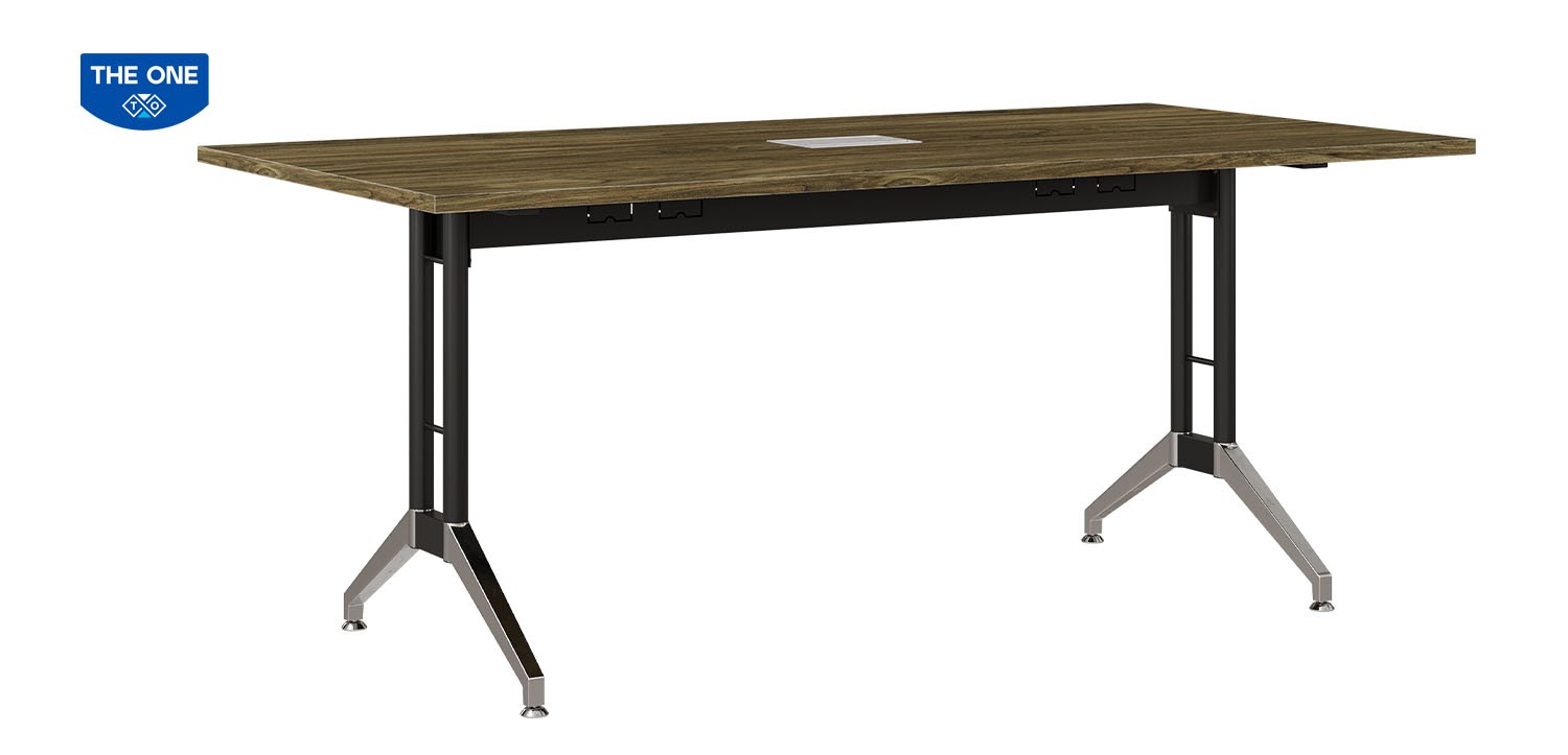 Bàn họp cao cấp mặt gỗ meleamin, kết hợp chân bàn ống thép sơn đen và mạ. Bàn có máng và hộp điện kết hợp làm khung giằng với kết cấu chắc chắn và tiện ích khi sử dụng.