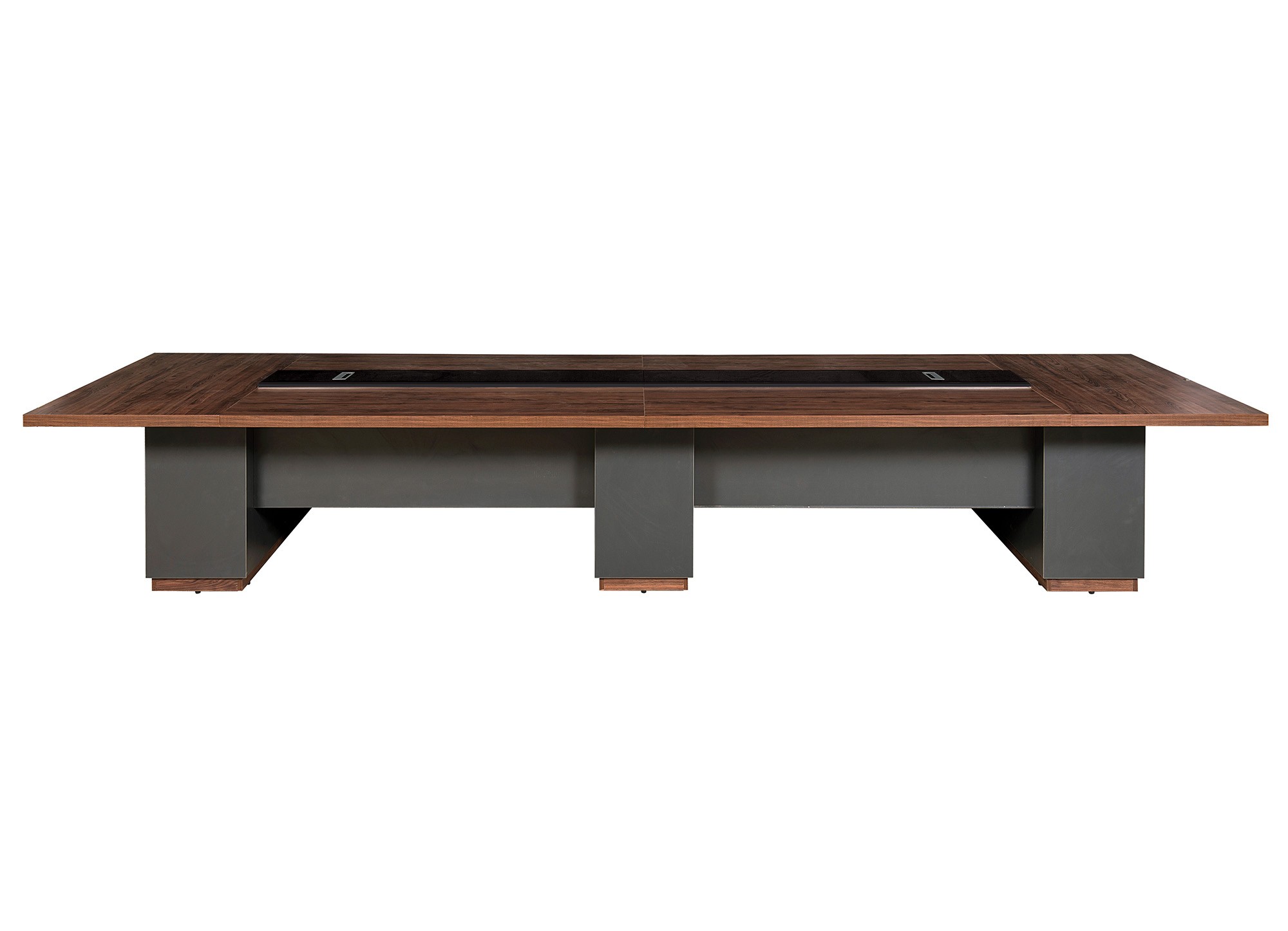 Bàn họp gỗ công nghiệp cao cấp, mặt bàn ghép hộp, có 2 hộp đi dây bằng nhôm cao cấp, chân bàn ghép hộp có nẹp nhôm trang trí mặt ngoài.