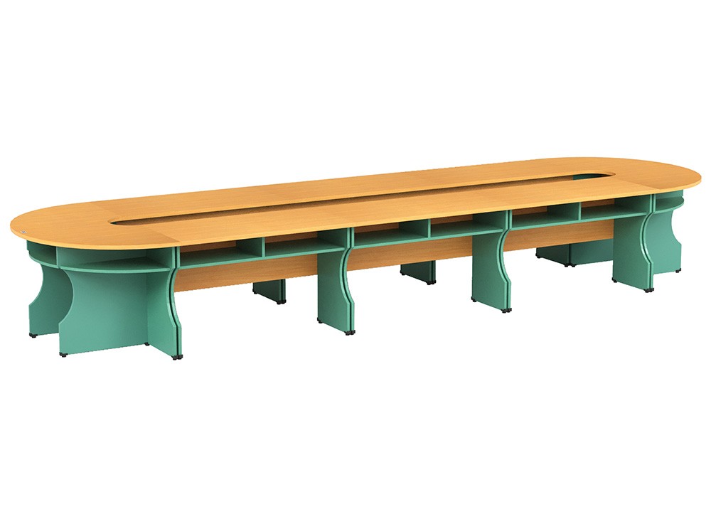 Bàn họp gỗ công nghiệp quây rỗng giữa, có các đợt để tài liệu và đợt để hoa ở giữa.