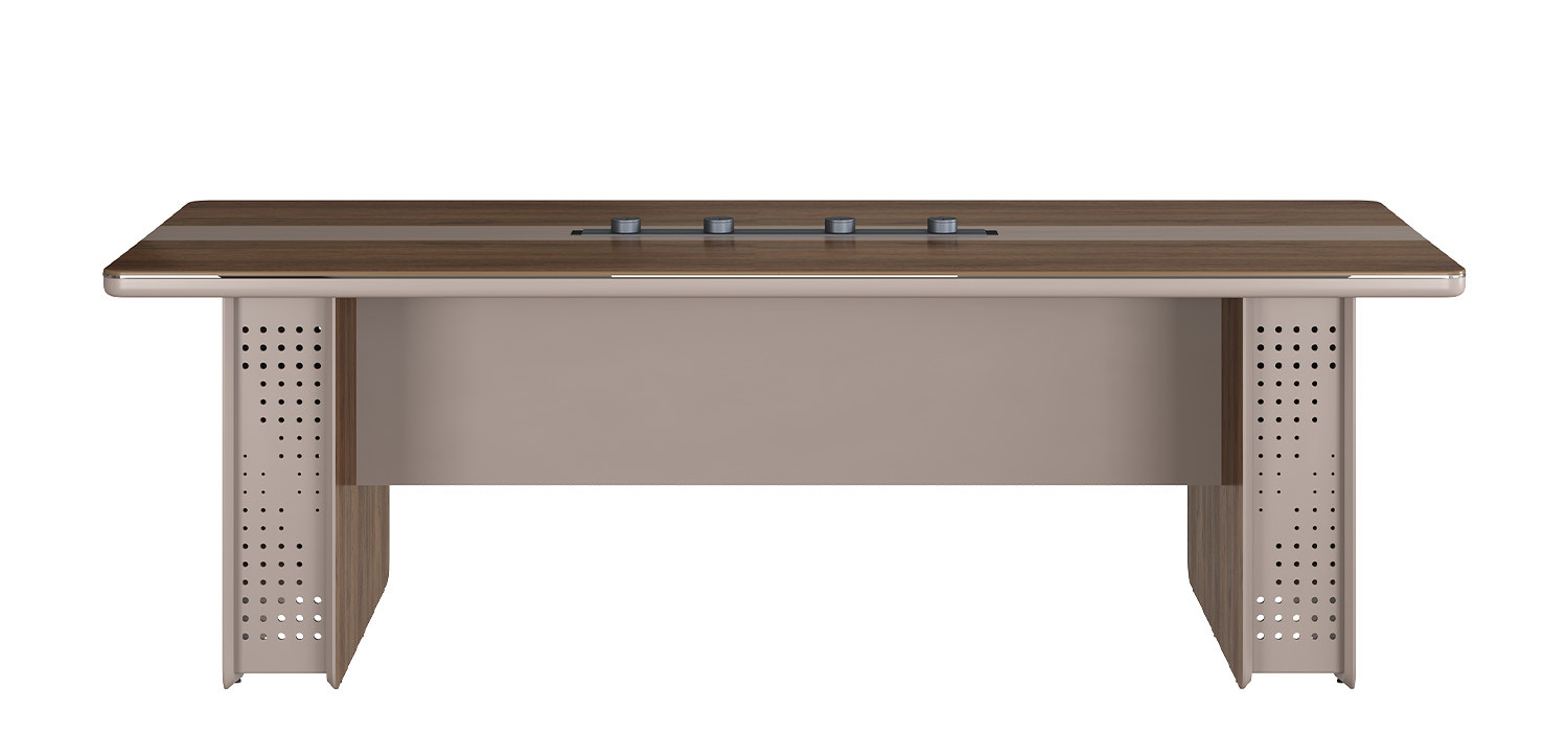 Bàn họp LUXURY SUPREME S9 chất liệu melamine kết hợp sơn PU, chân thiết kế dạng hộp trang trí lỗ tròn, mặt bàn có hệ thống ổ cắm di động hiện đại. Thanh ray và các ổ điện có thể di chuyển.