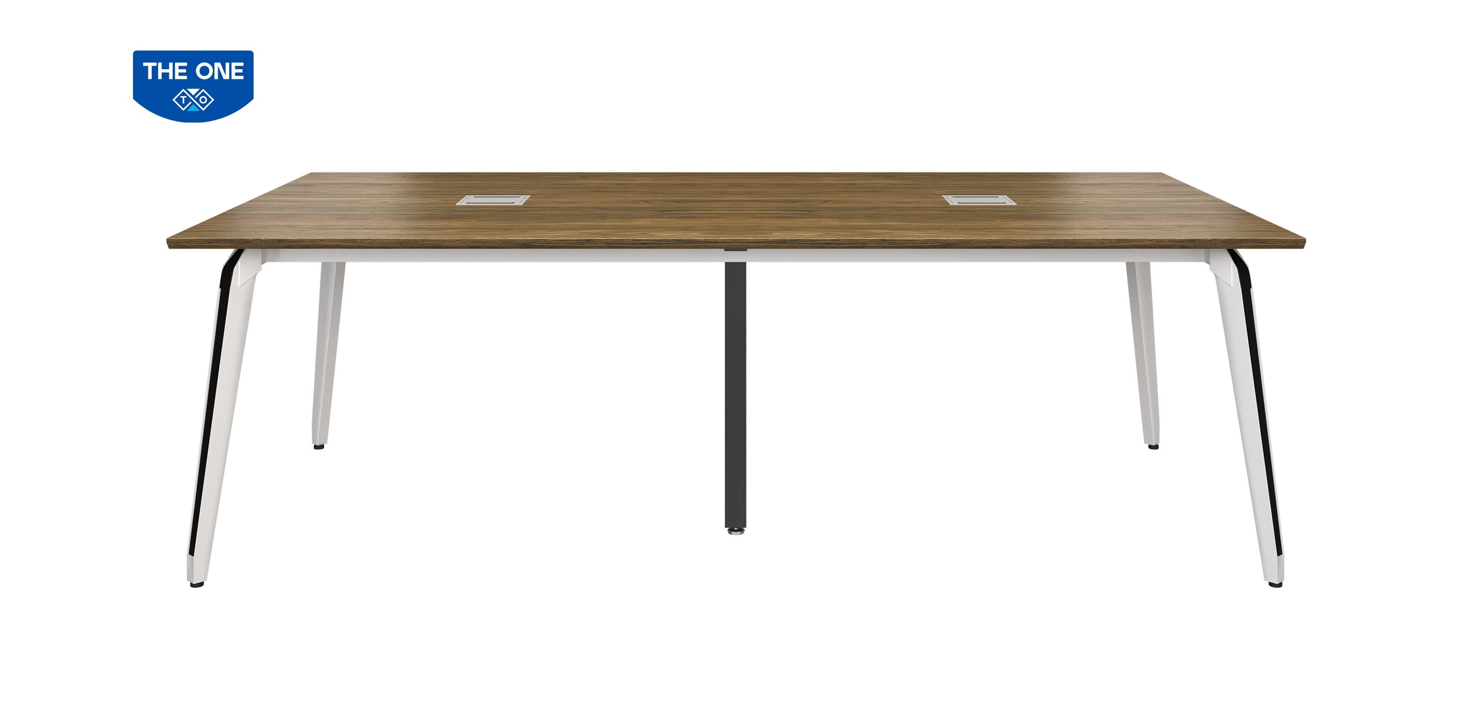 Bàn họp cao cấp mặt gỗ melamine vát cạnh 45 độ hai cạnh dài, bàn có 2 nắp ổ điện, kết hợp chân bàn thép dập định hình sơn trắng kết hợp ốp đen. Chân giữa tích hợp lỗ bắt ổ điện chờ.