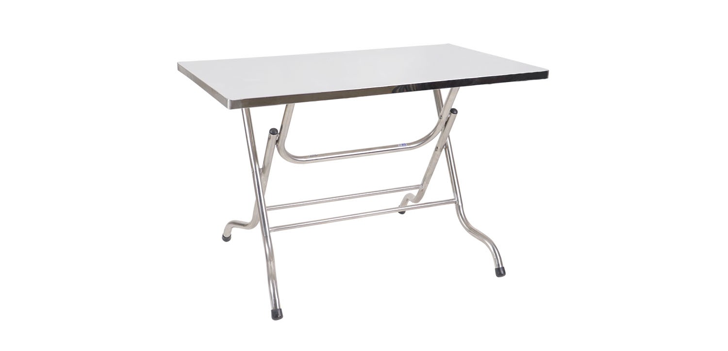 Bàn ăn chất liệu inox, mặt chữ nhật bo 4 góc, chân bàn gấp sử dụng ống kích thước 32mm.
