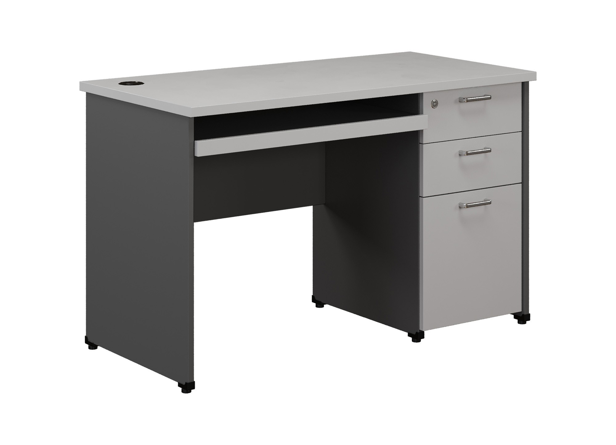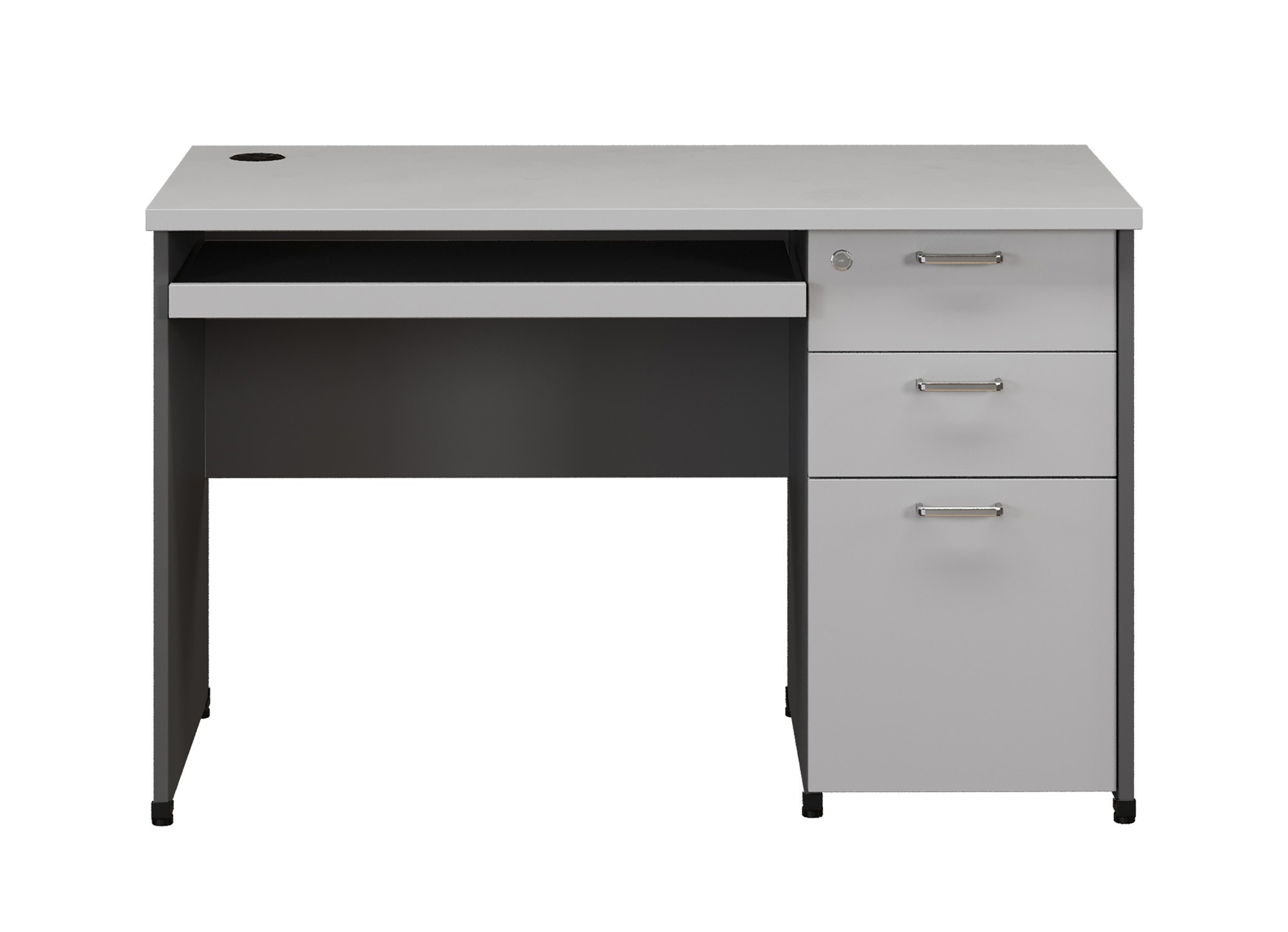 Bàn làm việc hộc liền, bàn có 3 ngăn kéo sát đất và có bàn phím.
