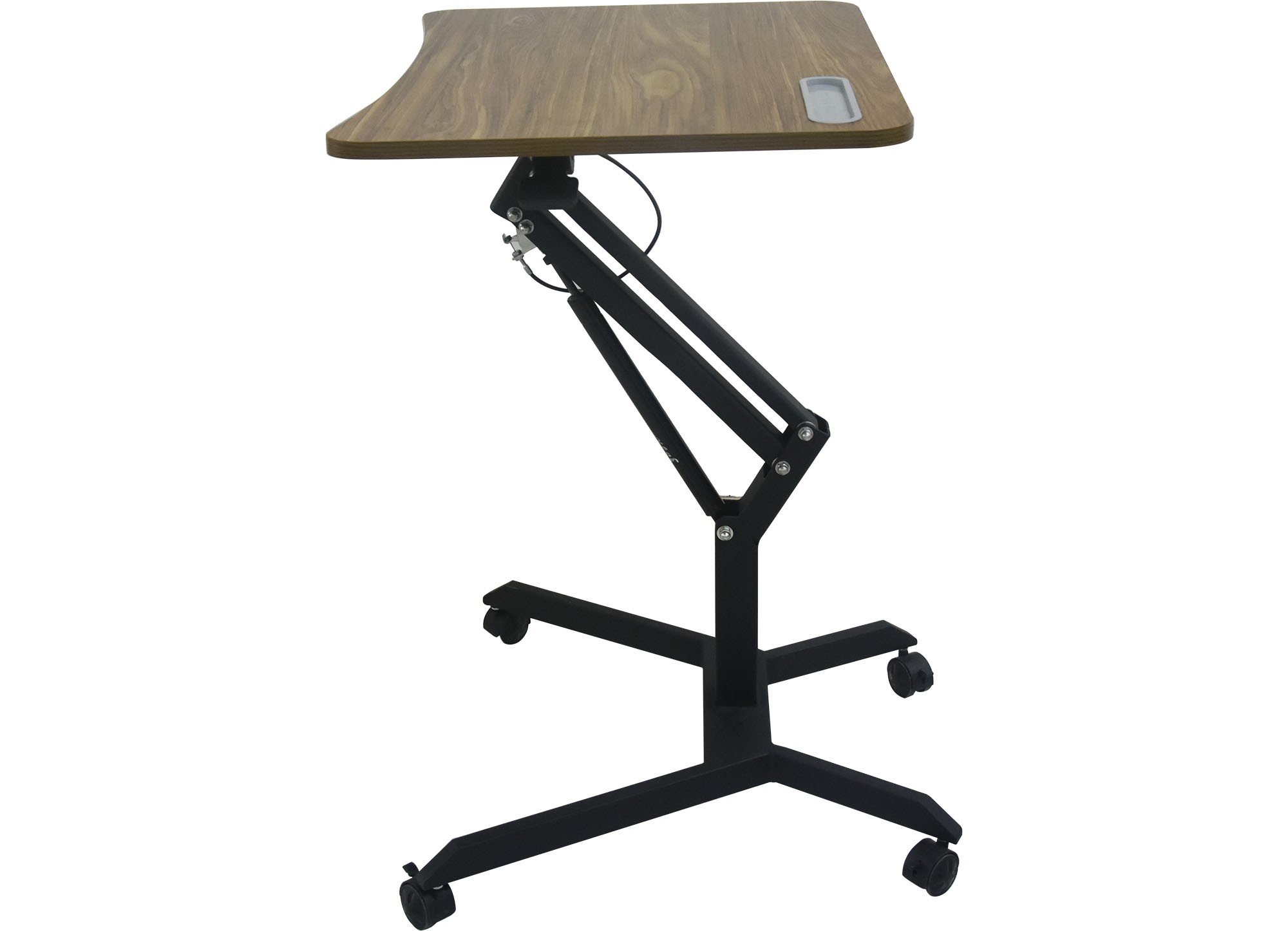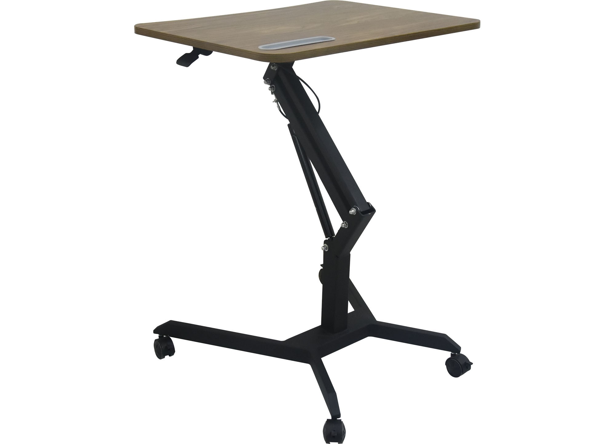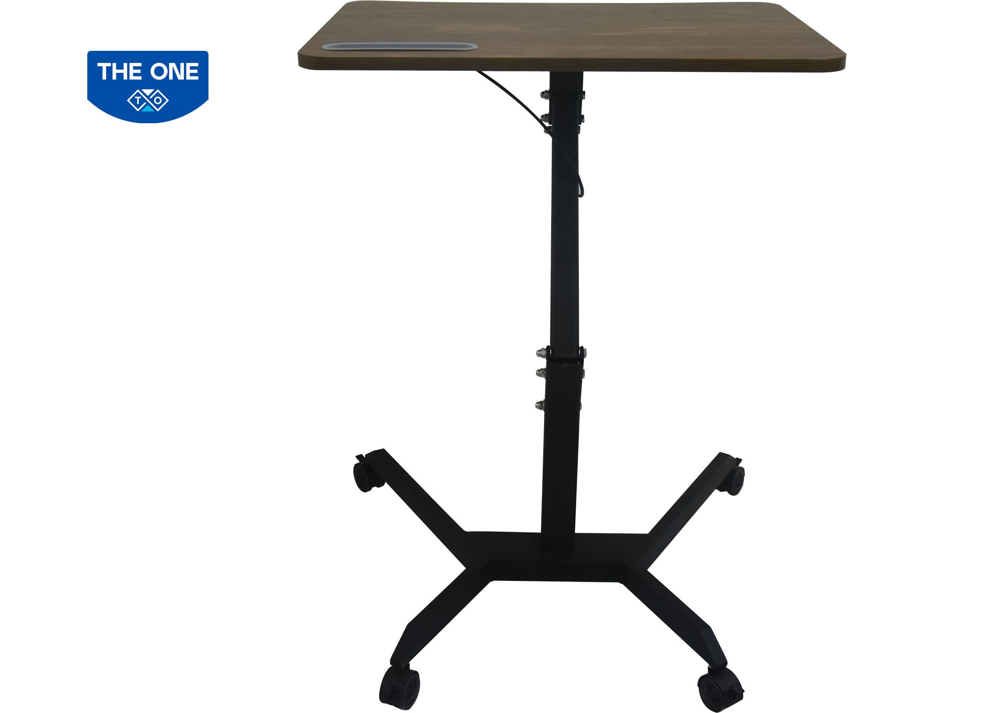 Bàn làm việc khung thép sơn tĩnh điện, mặt gỗ melamine màu vân gỗ. Khung bàn có thể điều chỉnh độ cao thấp tùy theo nhu cầu sử dụng. Chân đế có 4 bánh xe di động có khóa hãm.
