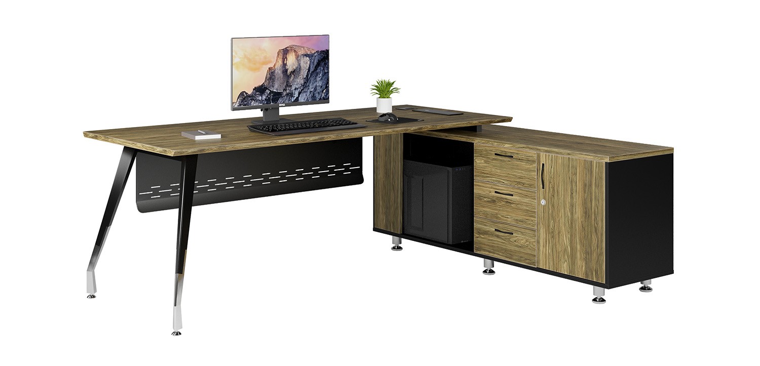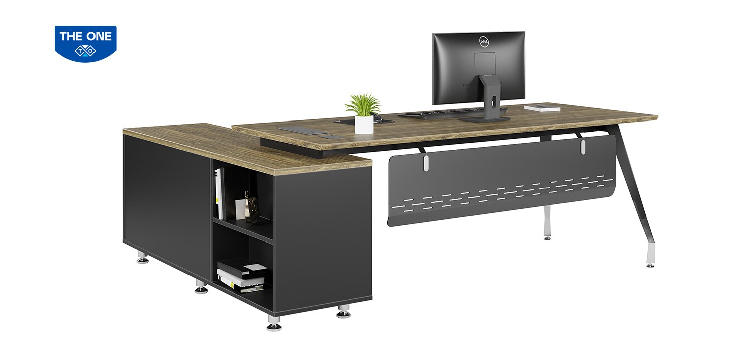 Bàn lãnh đạo có tủ phụ kèm 1 cánh mở và 3 ngăn kéo liền bàn. Mặt bàn gỗ melamine vát cạnh 45 độ hai cạnh dài,