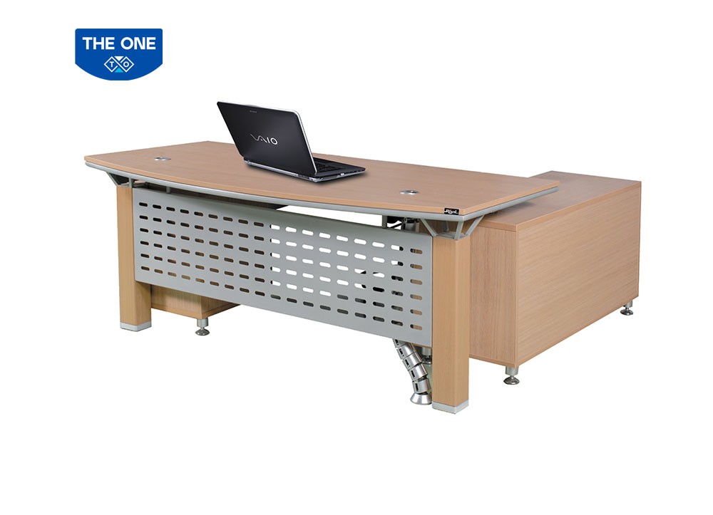 Bàn lãnh đạo gỗ Melamine, mặt bàn lượn cong có ốp gỗ sơn trang trí ở phía dưới.