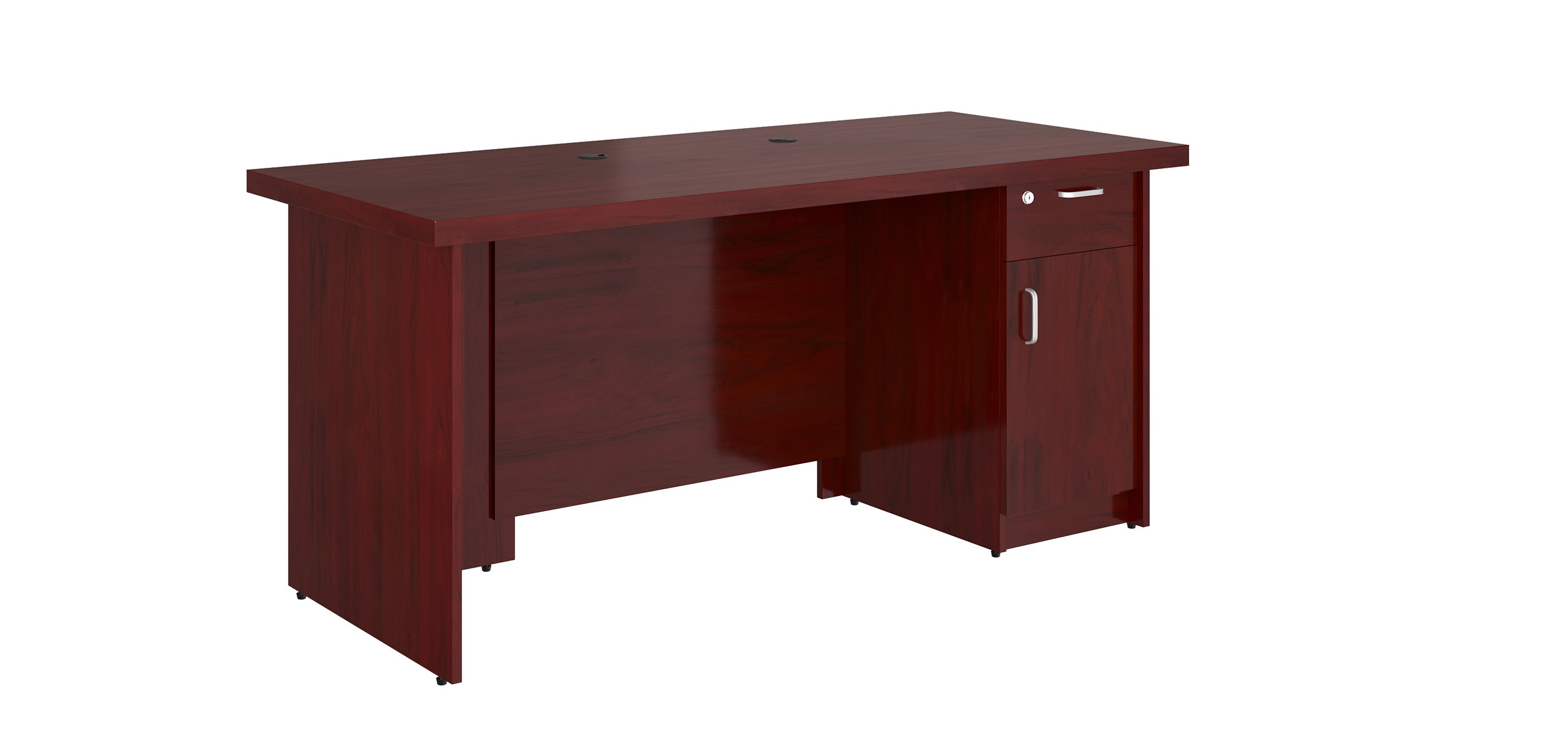 Bàn làm việc sơn PU với mặt bàn hình chữ nhật, ghép hộp dày 37mm, cạnh bàn được dán nẹp PVC. Bàn có hộc liền sát đất với 1 ngăn kéo và 1 cánh mở. Yếm bàn được dán giấy trang trí. Tay nắm nhôm, khóa chìa trắng