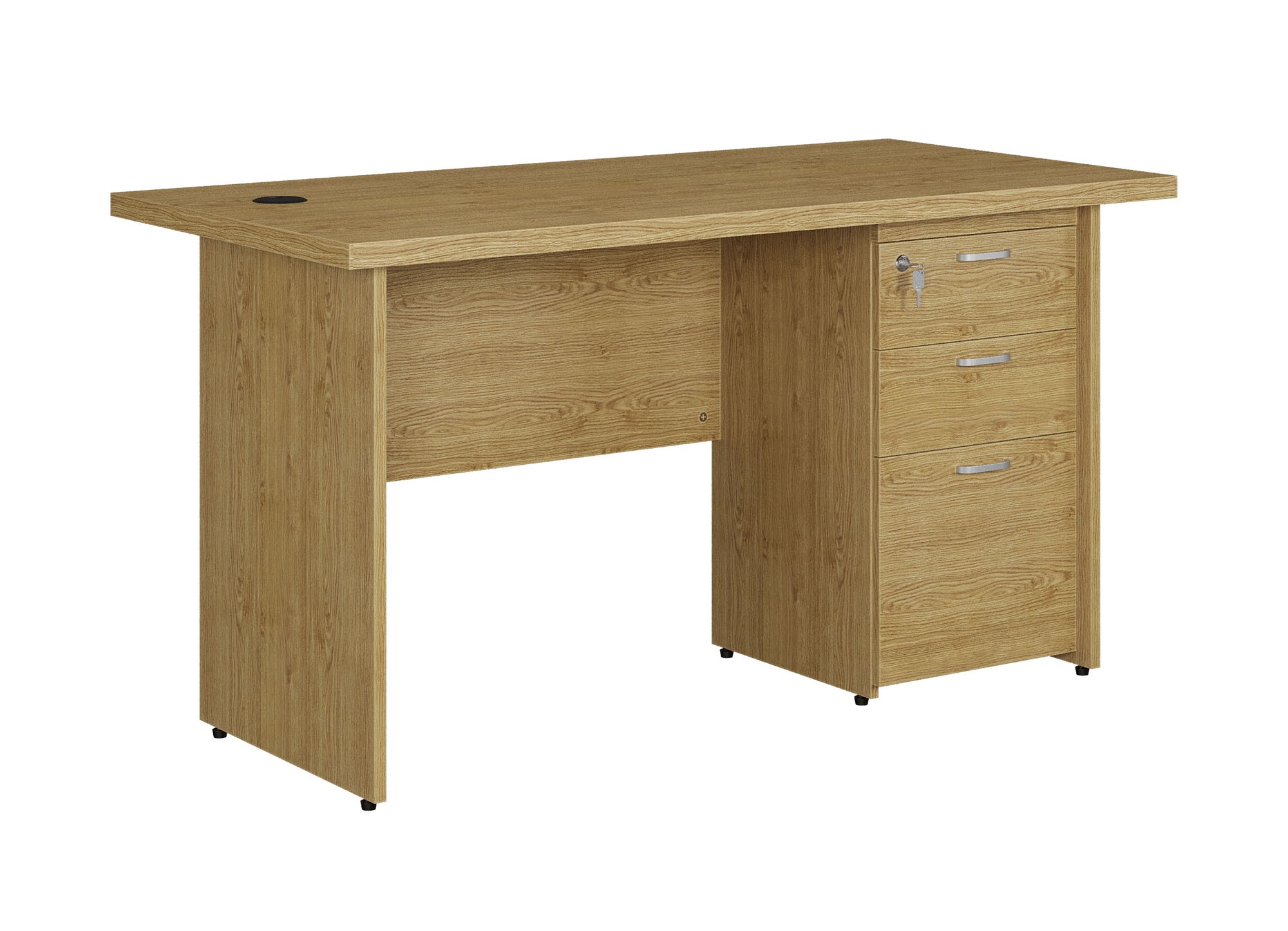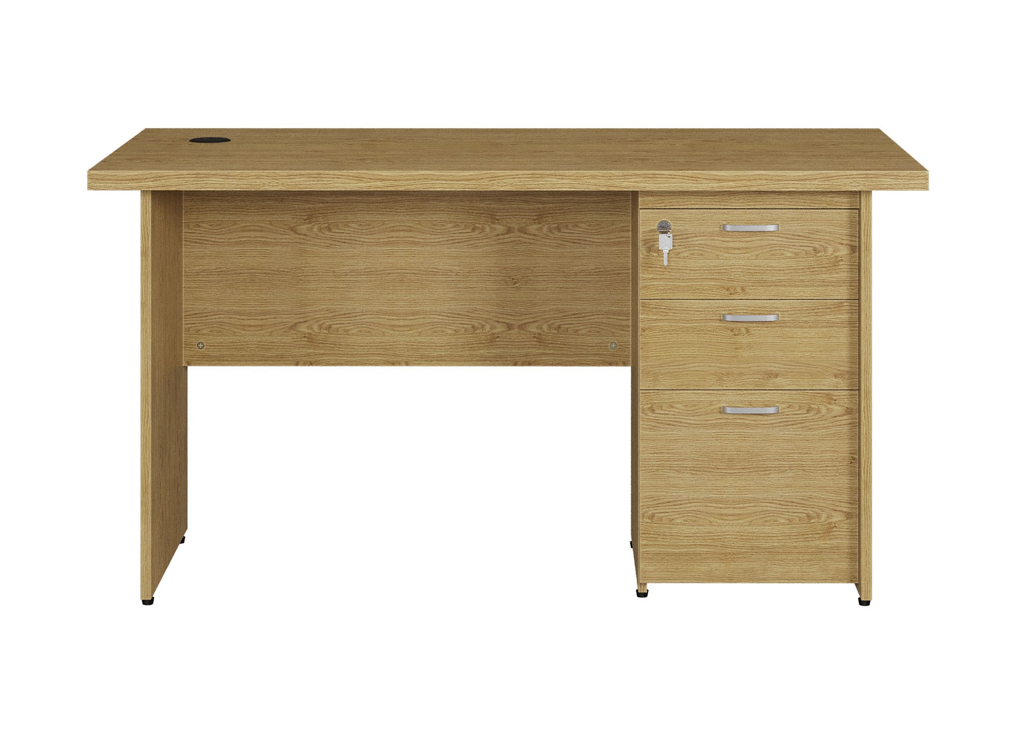 Bàn làm việc gỗ toàn bộ, mặt bàn ghép giả dày 32mm. Hộc sát đất 3 ngăn kéo có khóa dàn liền bàn