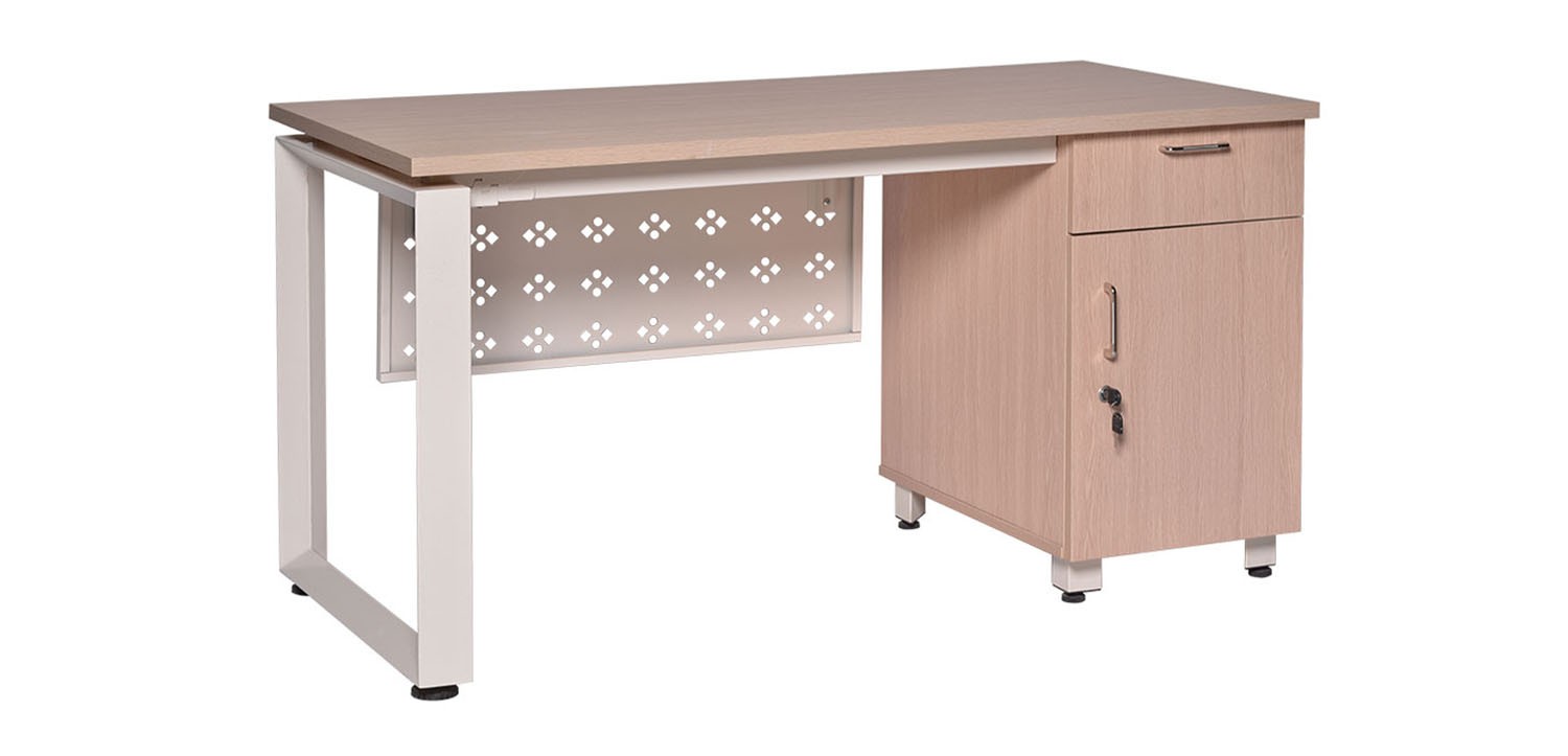 Bàn làm việc mặt gỗ melamine khung thép tam giác có hộc liền 1 ngăn kéo và 1 cánh mở.