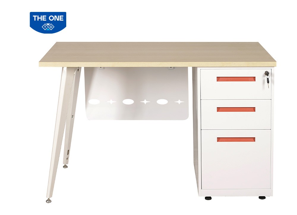 Bàn làm việc có hộc sắt, chân bàn sơn trắng, tay nắm âm màu cam.