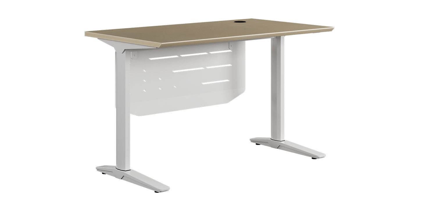 Bàn làm việc có yếm tôn trang trí, mặt bàn bằng melamine, có vát cạnh 45 độ phía người ngồi.