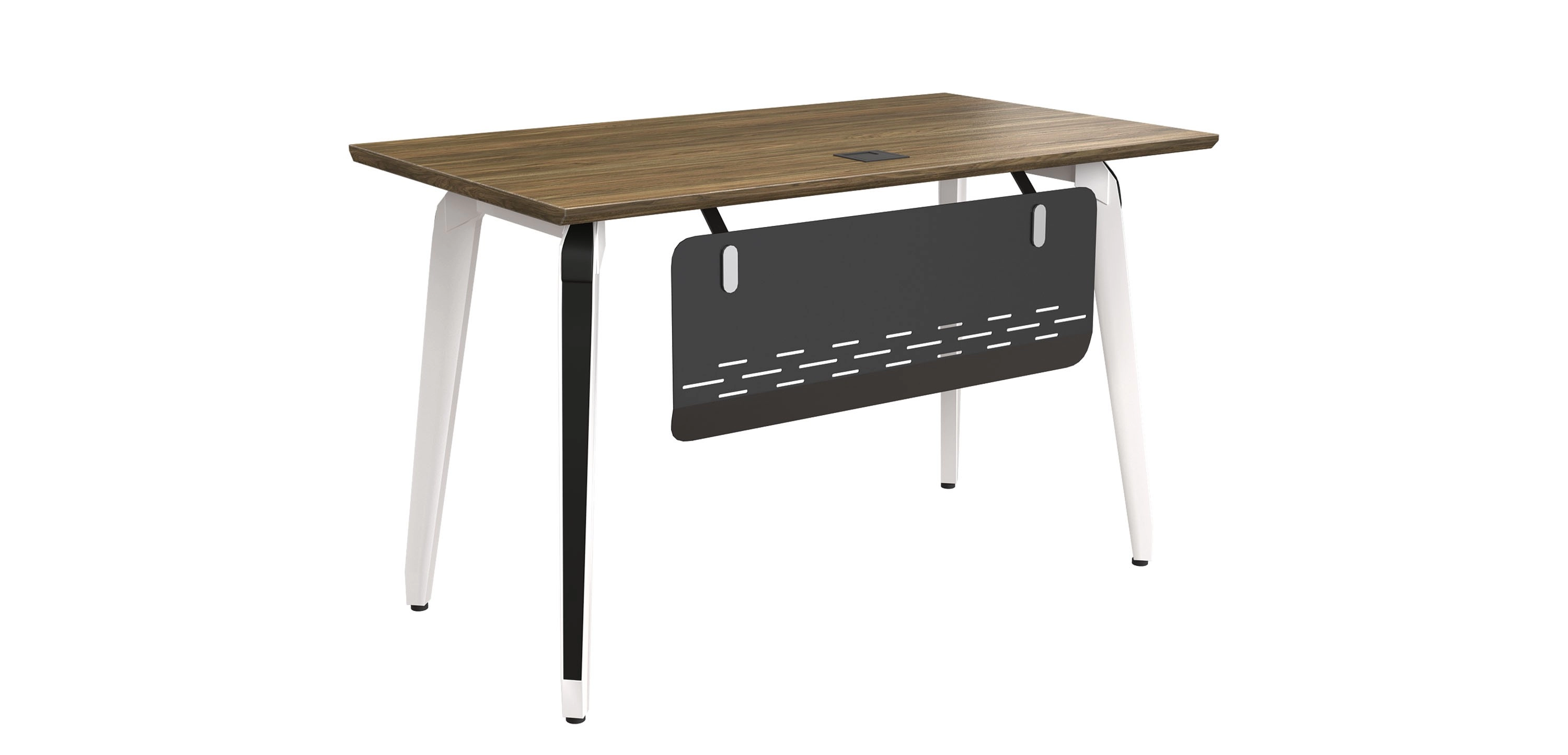 Bàn nhân viên cao cấp mặt gỗ melamine vát cạnh 45 độ hai cạnh dài, yếm tôn đột lỗ trang trí, kết hợp chân bàn thép dập định hình sơn trắng kết hợp ốp đen