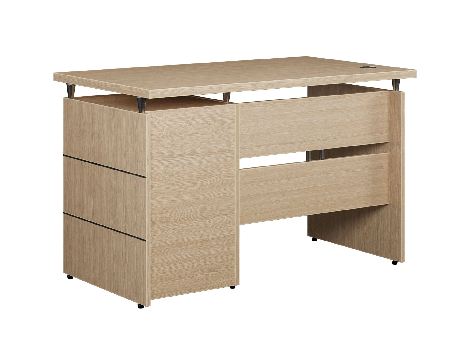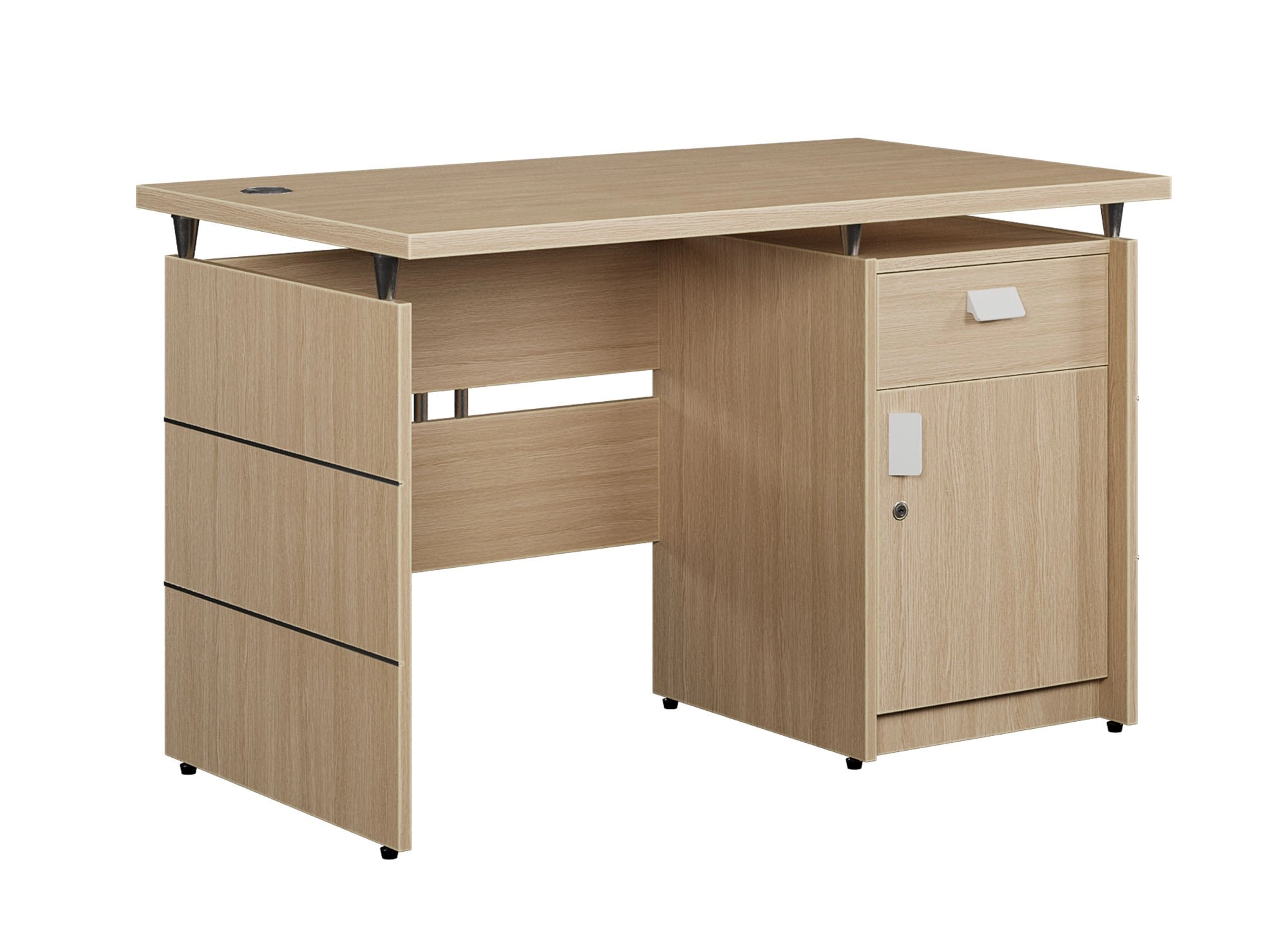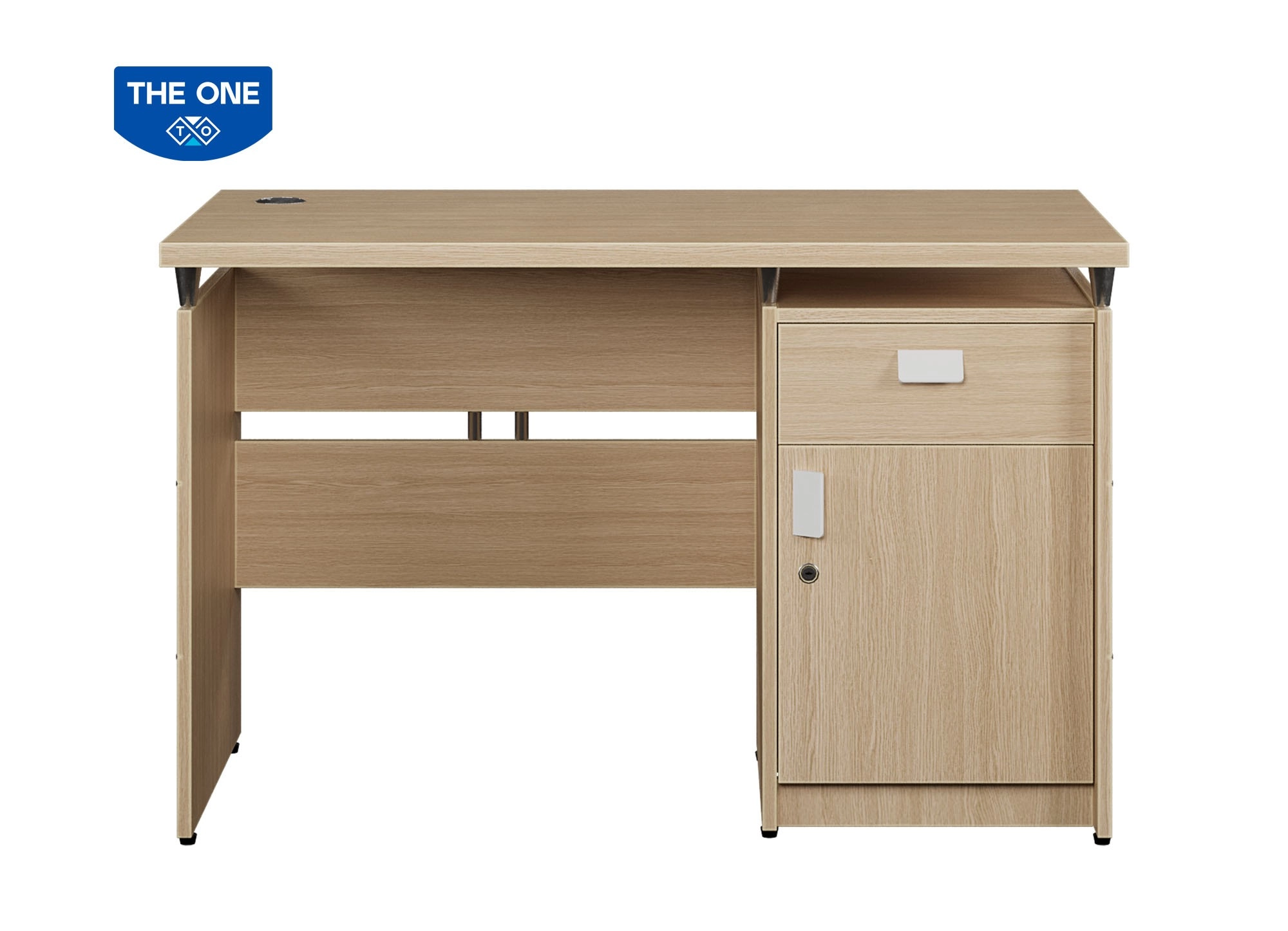 Bàn làm việc gỗ Melamine có hộc liền gồm 1 ngăn kéo và 1 cánh mở có khóa. Yếm bàn chia 2 tấm liên kết bằng trụ inox.