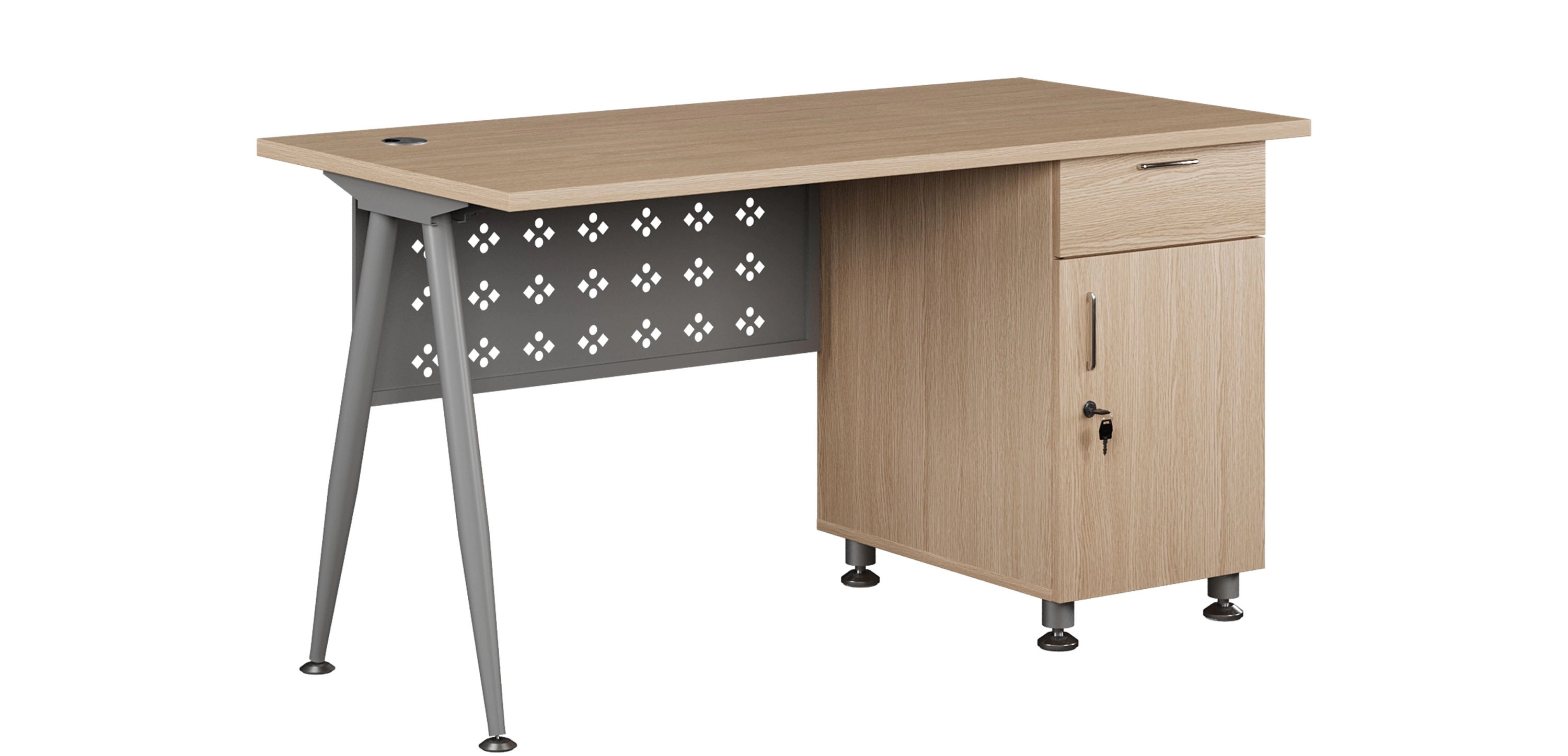 Bàn làm việc nhân viên khung thép được thiết kế bằng chân ống tóp. Mặt bàn gỗ melamine có hộc liền và yếm tôn đột lỗ trang trí (Yếm tôn ký hiệu Y1)