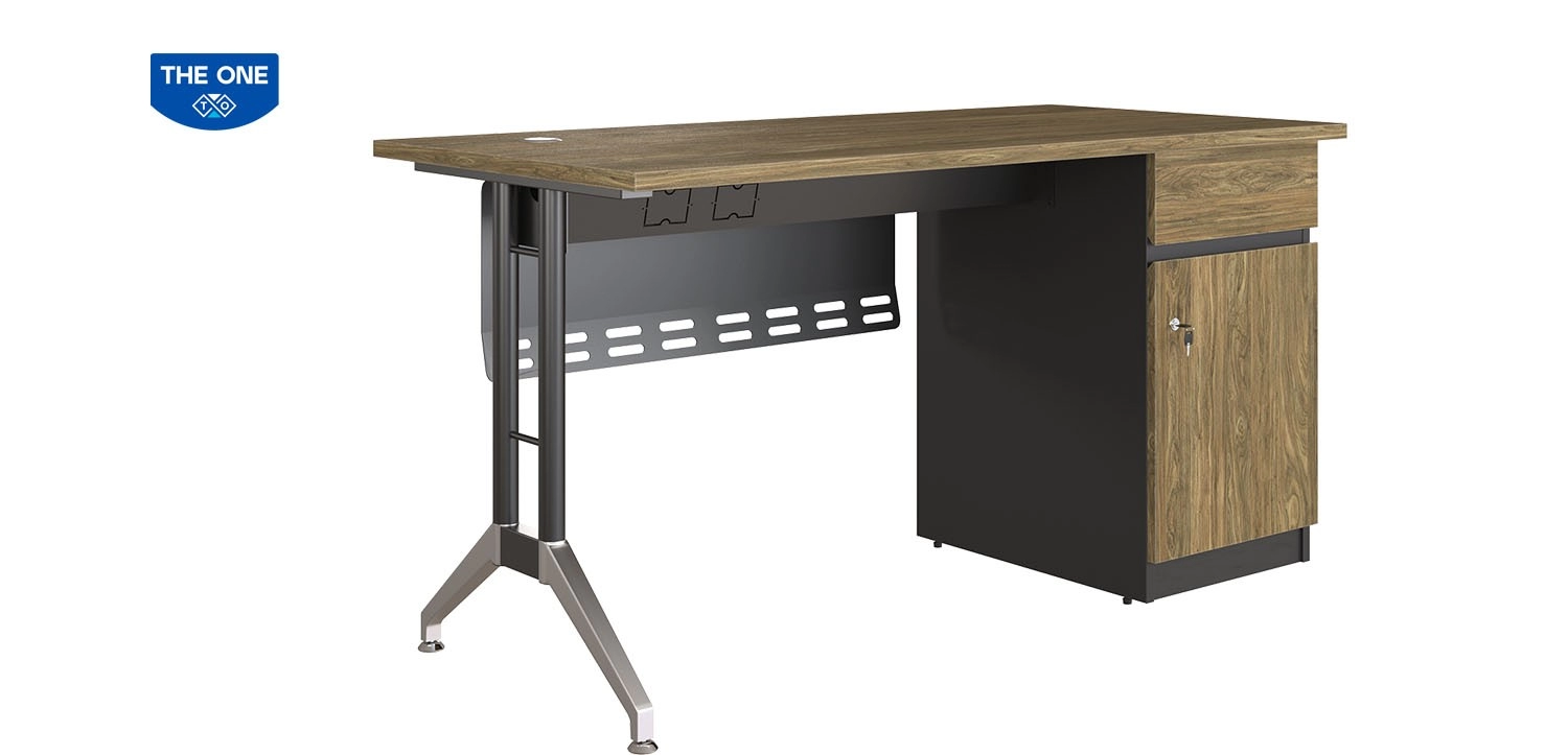 Bàn chuyên viên hộc liền cao cấp mặt gỗ meleamin, có yếm tôn, kết hợp chân bàn ống thép sơn đen và mạ. Bàn có máng điện kết hợp làm khung giằng với kết cấu chắc chắn và tiện ích khi sử dụng. Hộc liền gồm 1 ngăn kéo và 1 cánh mở, sử dụng tay nắm vát cạnh và có ổ khóa.