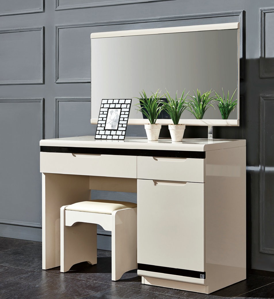 Bộ bàn ghế trang điểm màu kem. Mặt ngăn kéo dán vân gỗ nâu đỏ.