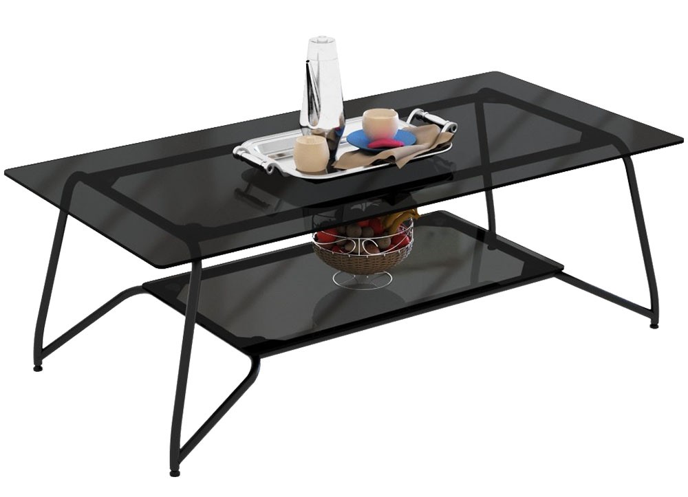 Bàn sofa khung thép sơn đen kết hợp mặt bàn kính cường màu xanh đen và một đợt kính để đồ phía dưới. Toàn bộ phần kính được bo tròn 4 góc tạo sự an toàn cho người sử dụng.