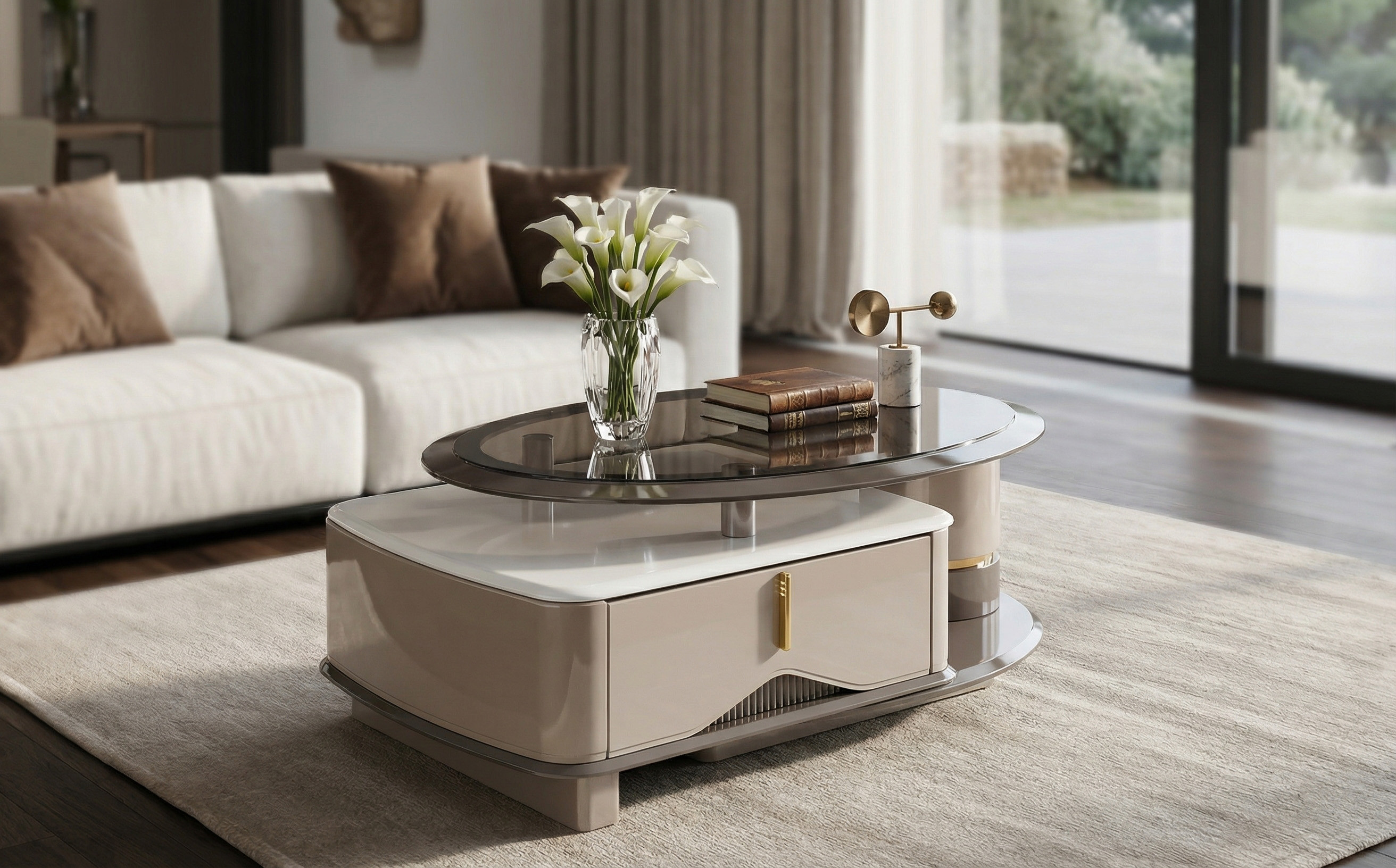 Bàn sofa cao cấp, gồm 2 bàn, bàn tròn mặt kính cường lực nâu trà, mặt dưới mặt đá, bên dưới gầm gỗ công nghiệp có ngăn kéo.