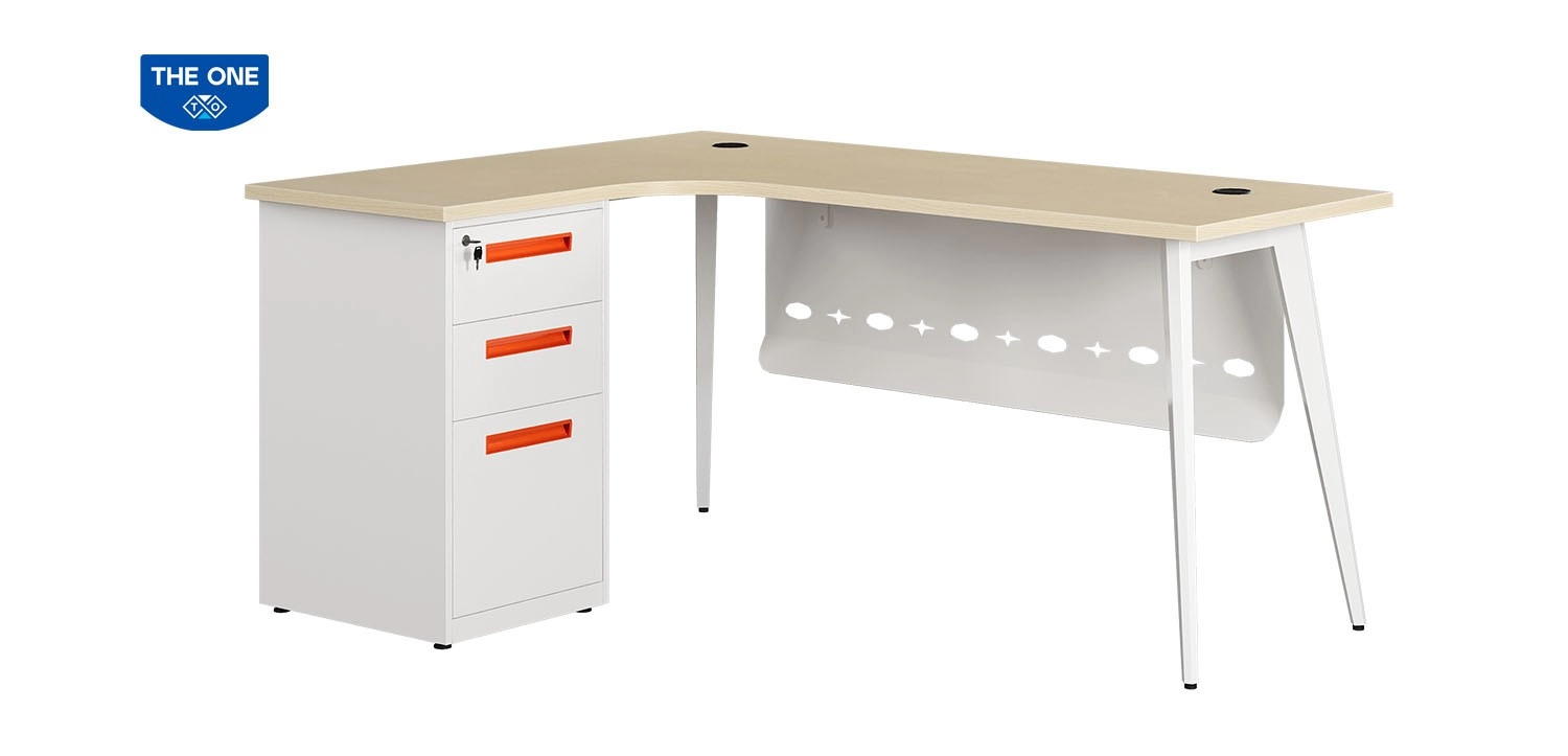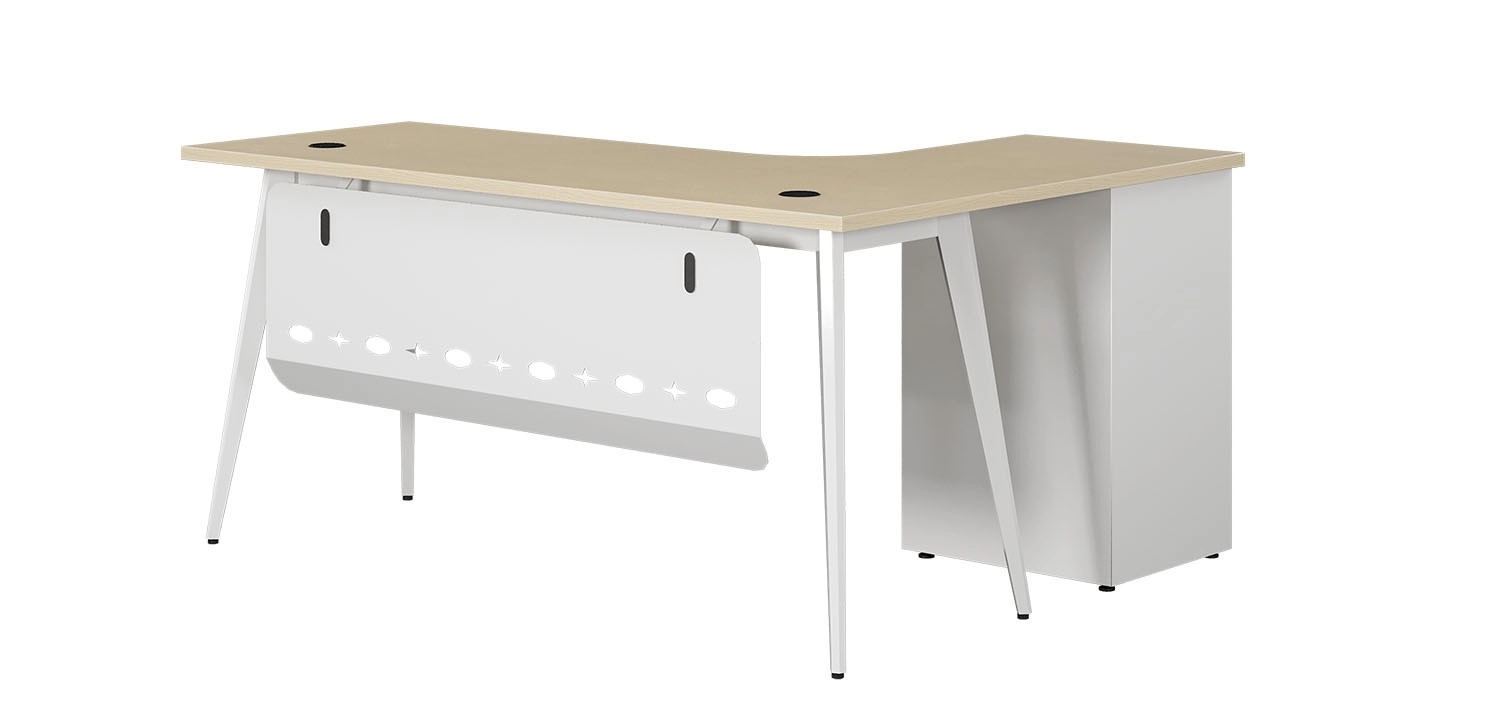 Bàn làm việc trưởng phòng mặt lượn gỗ Melamine, chân thép C10. Bàn có hộc sắt liền và yếm tôn đột lỗ trang trí