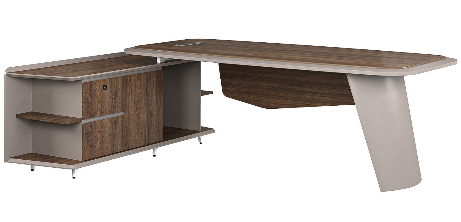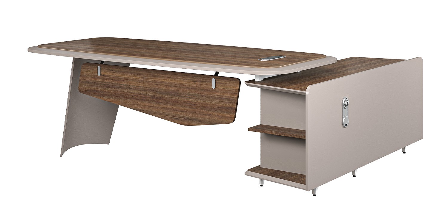Bàn lãnh đạo LUXURY SUPREME S8 chất liệu melamine kết hợp sơn PU. Bàn có thiết kế tủ phụ liền bàn có ngăn kéo cánh mở và khóa cảm ứng. Chân bàn uốn cong, mặt bàn ghép viền cạnh sơn. Mặt dày 40mm mặt trên ốp tấm melamin, bàn có nắp ổ cắm tích hợp lỗ đi dây hiện đại.