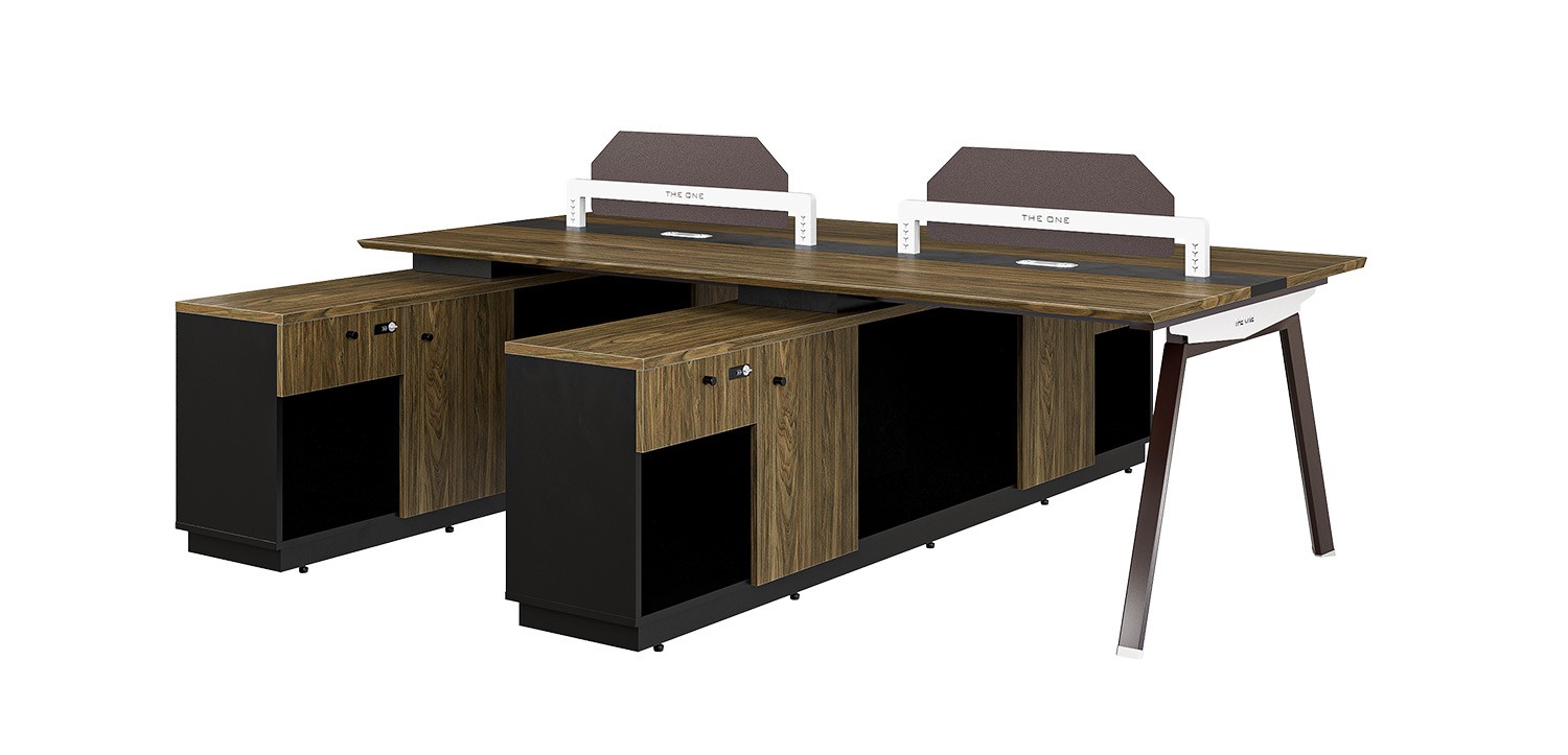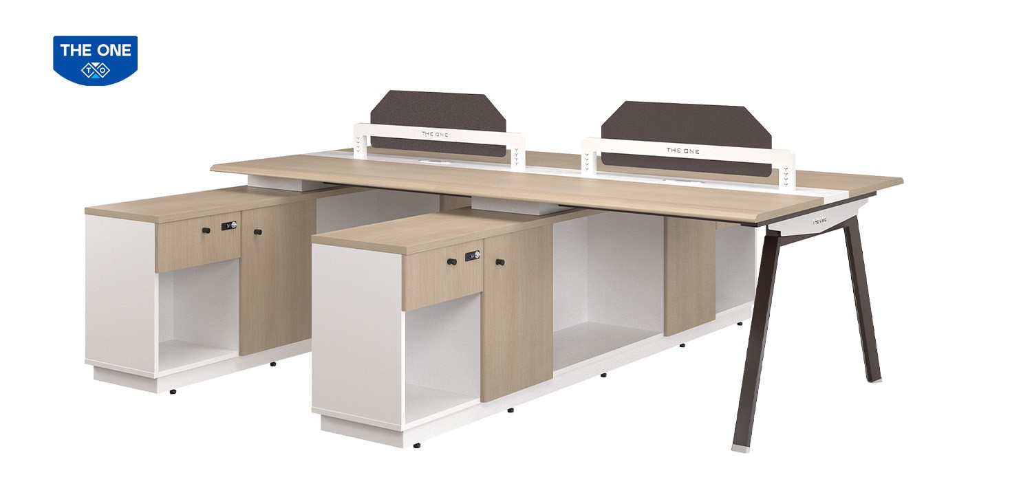 Bàn modul 4 chỗ, MD02-4C17 chân ống thép biên dạng mới. Bàn sử dụng gỗ phủ Laminate kết hợp melamine. Mặt bàn có vách gỗ kết hợp ống thép khắc lazer. Ngăn kéo hộc có sử dụng khóa số