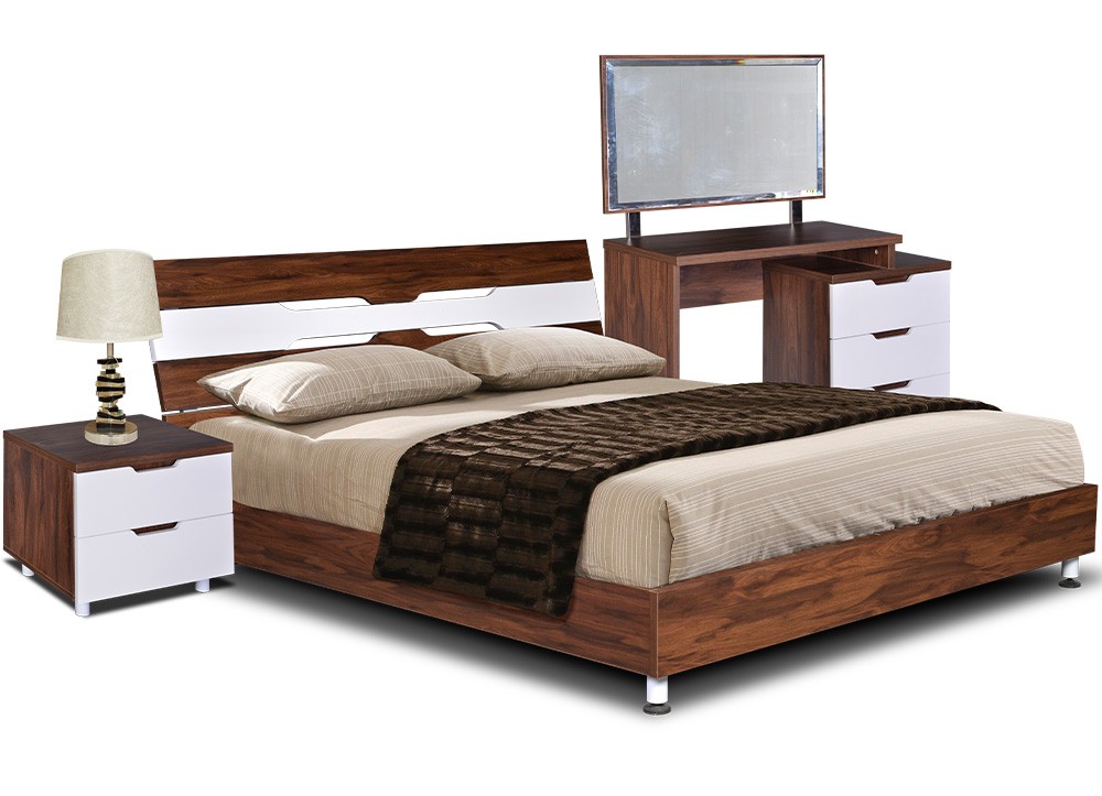 Bộ sản phẩm phòng ngủ người lớn, sử dụng chất liệu gỗ melamine và sơn Pu cao cấp kết hợp giữa hai tông màu gỗ và trắng.