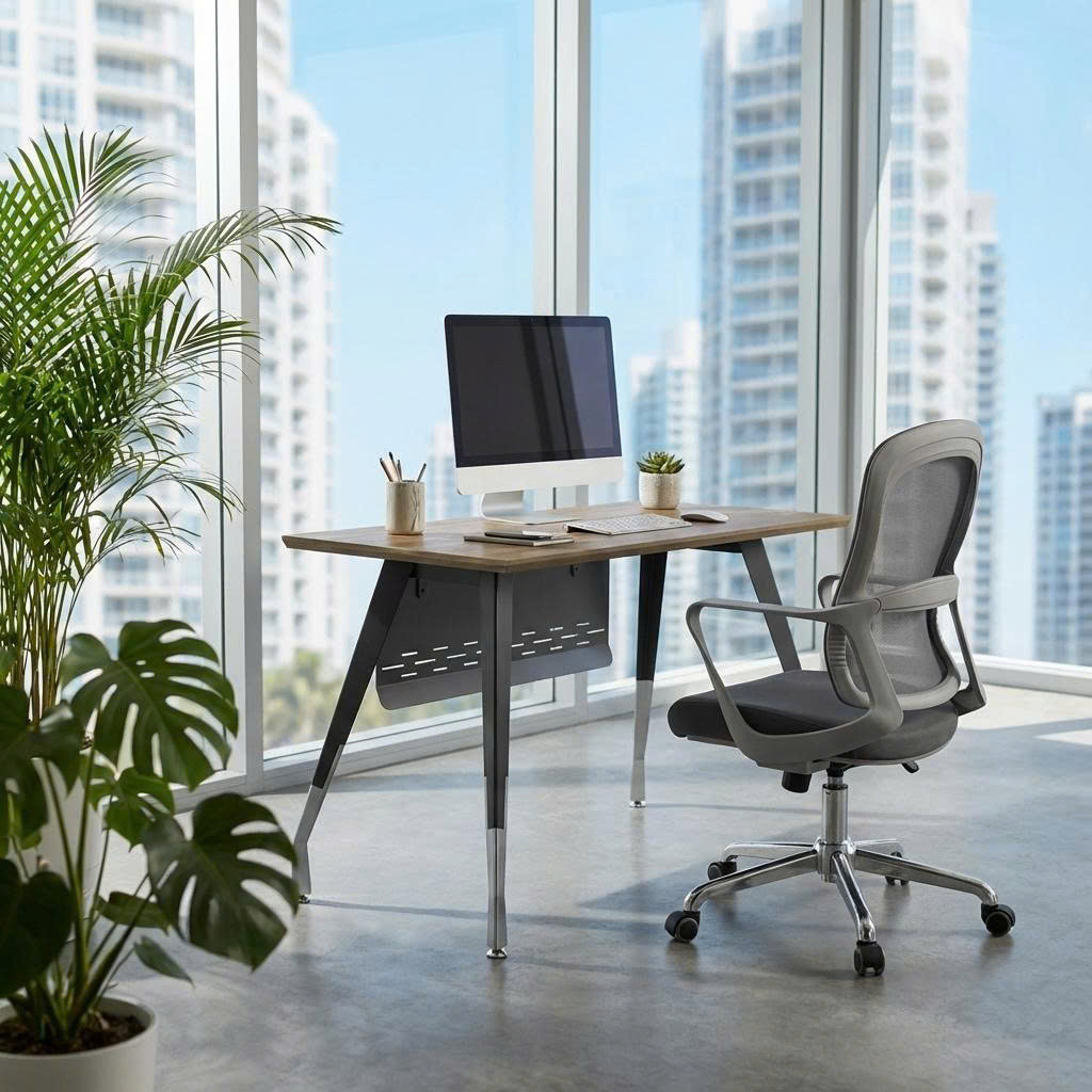 - Thiết kế vát cạnh: Thay vì các cạnh vuông vức thông thường, mặt bàn Bright được vát chéo 45 độ tinh xảo dọc theo hai cạnh dài. Chi tiết này tạo nên hiệu ứng thị giác "mỏng hóa", giúp mặt bàn gỗ trông thanh thoát hơn nhưng vẫn giữ được độ dày và sự vững chãi cần thiết. Biên dạng vát chéo còn mang lại sự thuận tiện và cảm giác dễ chịu cho cổ tay người sử dụng trong suốt quá trình làm việc dài.