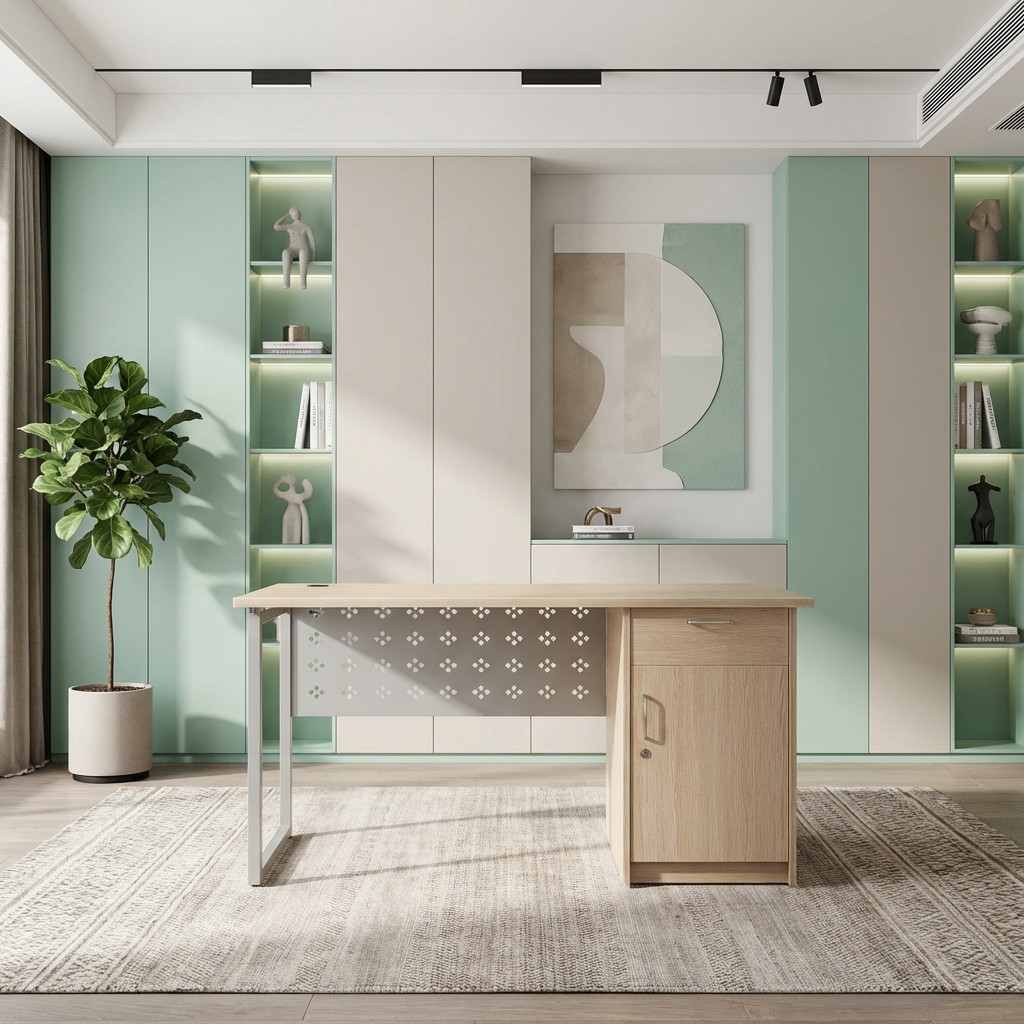 Gỗ Melamine: Sử dụng gỗ công nghiệp có độ dày tiêu chuẩn, bề mặt phủ Melamine cao cấp chống trầy xước và đặc biệt là khả năng chống ẩm vượt trội, phù hợp với khí hậu Việt Nam.
