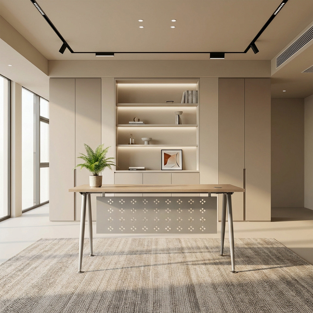 - HRP1890L2Y1: Bàn lãnh đạo gỗ Melamine, mặt bàn lượn cong có ốp gỗ sơn trang trí ở phía dưới. Bàn sử dụng yếm tôn
