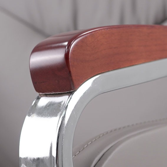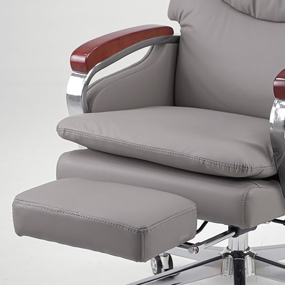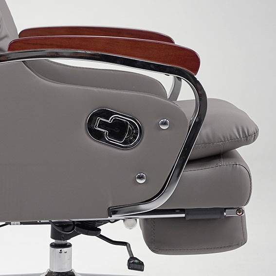 Ghế lãnh đạo cao cấp có khung cốt gỗ chắc chắn, đệm tựa được bọc bằng chất liệu giả da cao cấp, mang lại cảm giác mềm mại và êm ái. Ghế có thể điều chỉnh độ cao và độ ngả, cùng với cơ cấu để chân tiện lợi khi sử dụng. Tay ghế được làm bằng thép mạ và có ốp gỗ sơn, tạo điểm nhấn vừa thẩm mỹ vừa chắc chắn. Chân ghế được làm từ thép mạ, đảm bảo độ bền và tính thẩm mỹ.
